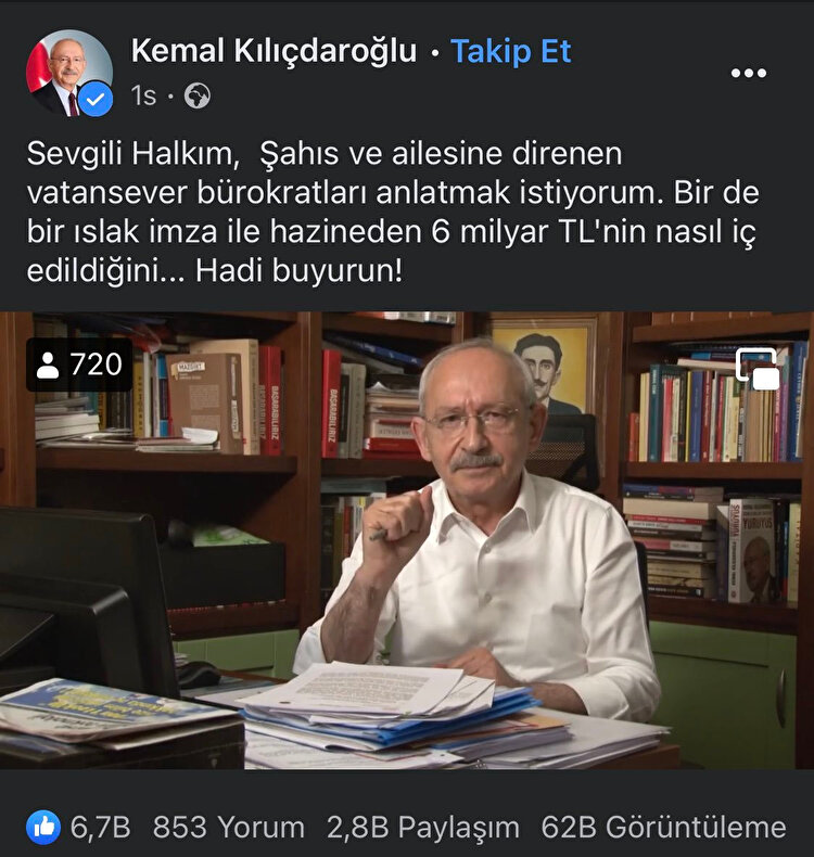 Kılıçdaroğlu’nun aynı videosu, Facebook’ta ise sadece 62 bin kişi tarafından izlendi. Anlık olarak izlenme sayısı 720 kişide kaldı.