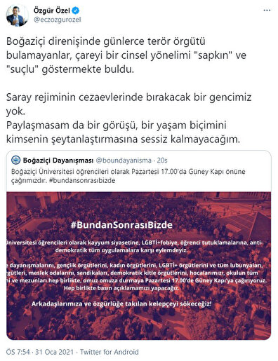 “Boğaziçi direnişinde günlerce terör örgütü bulamayanlar, çareyi bir cinsel yönelimi "sapkın" ve "suçlu" göstermekte buldu. Cezaevlerinde bırakacak bir gencimiz yok. Paylaşmasam da bir görüşü, bir yaşam biçimini kimsenin şeytanlaştırmasına sessiz kalmayacağım”