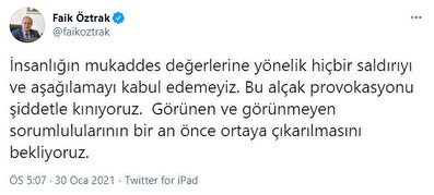 “İnsanlığın mukaddes değerlerine yönelik hiçbir saldırıyı ve aşağılamayı kabul edemeyiz. Bu alçak provokasyonu şiddetle kınıyoruz. Görünen ve görünmeyen sorumlulularının bir an önce ortaya çıkarılmasını bekliyoruz”