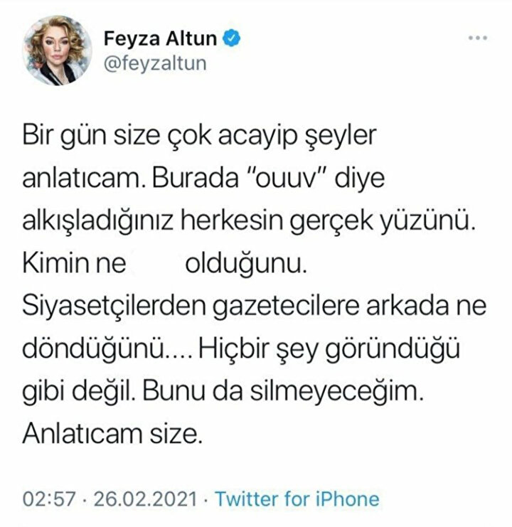 Altun, paylaşımında "Bunu da silmeyeceğim. Anlatacağım size" dese de bir süre sonra attığı tweeti silmek zorunda kalmıştı. .