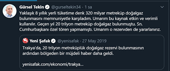 Cumhurbaşkanı Recep Tayyip Erdoğan, milyonların beklediği müjdeli haberi açıkladı ve Fatih Sondaj Gemisi'nin Karadeniz’de 320 milyar metreküp doğal gaz bulduğunu duyurdu. Muhalefeti rahatsız eden büyük haberle ilgili çirkin paylaşımlar yapıldı. Ancak CHP İstanbul Milletvekili Mehmet Bekaroğlu, sosyal medya hesabından şaşırtan bir açıklamada bulundu. Bekaroğlu, "Çok şükür, bu, gelecek açısından son derece ümit verici bir durum. Eğer bu rakamlar ve beklentiler doğru çıkarsa iktidara geldiğimzide enkaz devralmayacağız" ifadelerini kullandı.