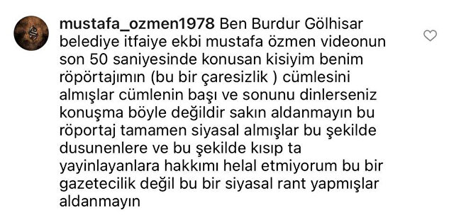 Videoda yer aldığını ifade eden itfaiyeci Mustafa Özmen, sözlerinin kırpılarak verildiğini öne sürdü.