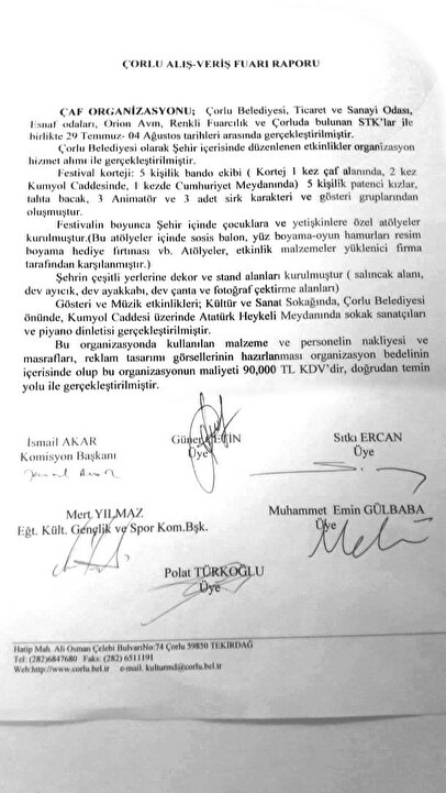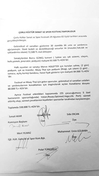 29 Ağustos - 2 Eylül tarihleri arasında düzenlenen 10. Çorlu Belediyesi Kültür Sanat ve Spor Festivali için ise belediyenin muslukları sonuna kadar açıldı. Stant bedeli ve destekleyici unsurlar ile masa, halı, tak ve ışıklandırma sistemi için 72 bin 500 TL harcandı. Sanatçı Burcu Güneş konseri için KDV hariç 93 bin 500 TL, halk oyunları ve sanatçı Merve Holfter için kurulan sahne, podyum, ışık sistemi açılış kortej bandosu, havai fişek gösterisi için ise KDV hariç 84 bin TL'lik harcama yapıldığı festival raporuna yansıdı. Tüm gider kalemleri hesaplandığında CHP’li Çorlu Belediyesi’nin kasasından KDV hariç 338 bin TL tutarında ücret çıktı. İki festival için toplamda KDV hariç 428 bin TL harcandı.