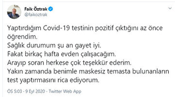 - Açıklamayı sosyal medya hesabından yapan Faik Öztrak, paylaşımında, "Yakın zamanda benimle maskesiz temasta bulunanların test yaptırmasını rica ediyorum" dedi.