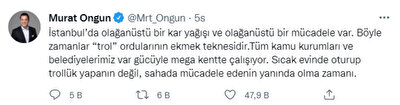 Ongun sosyal medya hesabından yaptığı paylaşımda, "İstanbul'da olağanüstü bir kar yağışı ve olağanüstü bir mücadele var. Böyle zamanlar "trol" ordularının ekmek teknesidir.Tüm kamu kurumları ve belediyelerimiz var gücüyle mega kentte çalışıyor. Sıcak evinde oturup trollük yapanın değil, sahada mücadele edenin yanında olma zamanı." ifadelerine yer verdi.