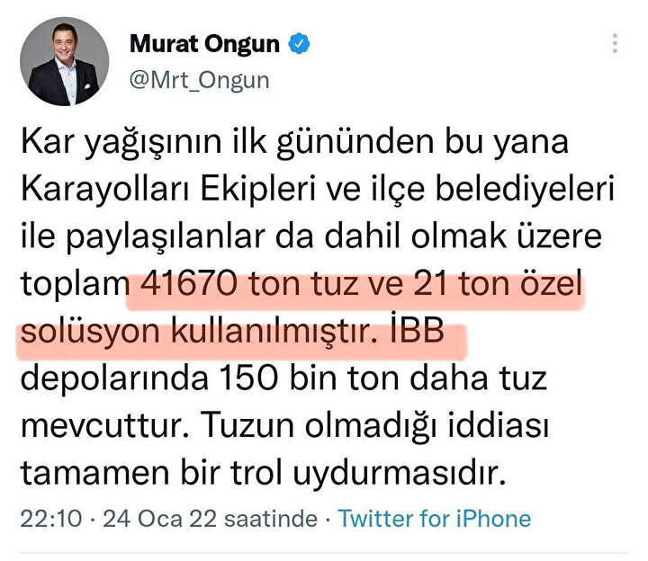 Uzmanlar tarafından günler öncesinden yapılan uyarılara rağmen megakent İstanbul kara önlemsiz yakalandı. Kentin birçok bölgesinde trafik dururken, binlerce vatandaş yollarda mahsur kaldı. Bazı vatandaşların araçlarını terk edip yürüyerek evlerine ulaşmaya çalışırken, İstanbul’u kara teslim eden İBB’nin sözcüsü karda mağdur olan vatandaşların sıcak evlerinde oturduğunu iddia etti ve onları trollükle suçladı. Ongun’un yaptığı paylaşımda ise 2017 yılına kıyasla yapılan çalışmaların yetersizliği dikkat çekti. Vatandaşlardan Ongun'un paylaşımına tepki yağdı.