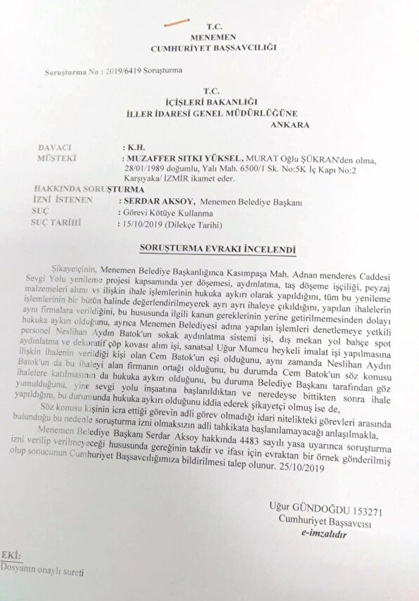 - Aksoy hakkında 2 Ekim 2019’da da suç duyurusunda bulunuldu. Suç duyurusu dilekçesinde, Aksoy’un Sevgi Yolu yenileme çalışmalarında kullanılan taşların bittikten sonra ihaleye çıkartıldığı, belediyeye kiralanan çöp araçları alındıktan sonra ihale edildiği ve sokak hayvanlarını kurtarma araçlarının piyasa fiyatından çok yüksek fiyatlara kiralandığı iddia edildi. 15 Ekim 2019 tarihinde yapılan bir başka suç duyurusunda yine Sevgi Yolu yenileme projelerindeki hukuksuzluklara değinildi. Yer döşemesi, ayınlatma, taş döşeme işçiliği, peyzaj malzemeleri alımına ilişkin ihale işlemlerinin hukuka aykırı olarak yapıldığı ifade edildi. Yapılan ihalelerin ise aynı firmalara verildiği belirtildi. Ayrıca Menemen Belediyesi adına yapılan işlemleri denetlemeye yetkili personel Neslihan Aydın Batok’un sokak aydınlatma sistemi işi, dış mekan yol bahçe spot aydınlatma ve dekoratif çöp kovası alım işi, sanatsal Uğur Mumcu heykeli imalat işi yapılmasına ilişkin ihalenin verildiği kişi olan Cem Batok’un eşi olduğu belirtildi. Neslihan Aydın Batok’un da ihaleyi alan firmanın ortağı olduğu söylendi. Bu durumun belediye başkanı tarafından göz yumulduğu iddia edildi.