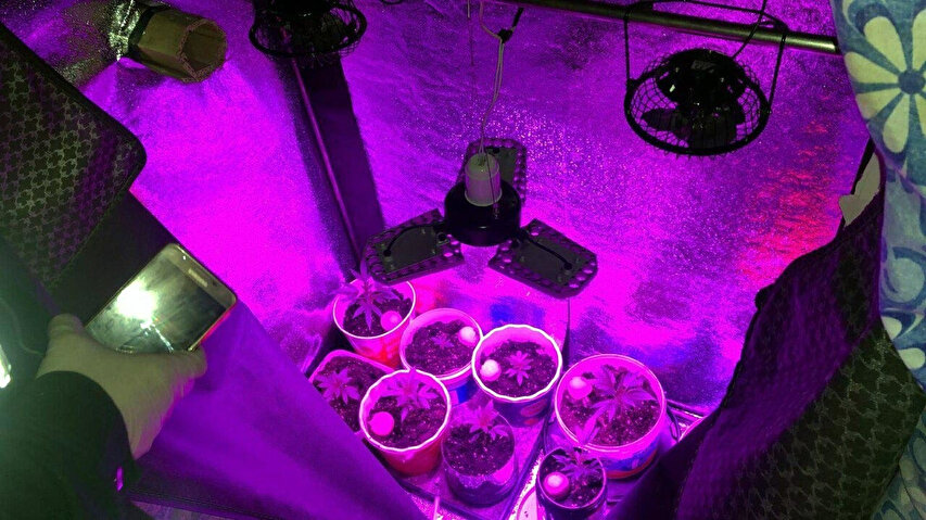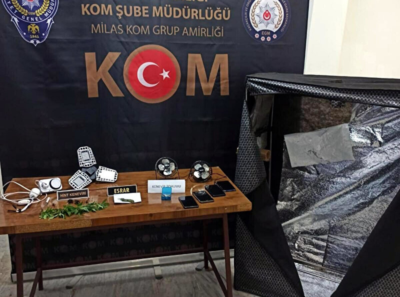 Şüphelilerden A.F.A'nın evinde yapılan aramada 3.27 gram esrar, 12.14 gram kenevir tohumu, 8 kök hintkeneviri ve kenevir yetiştirme düzeneği ele geçirildi.