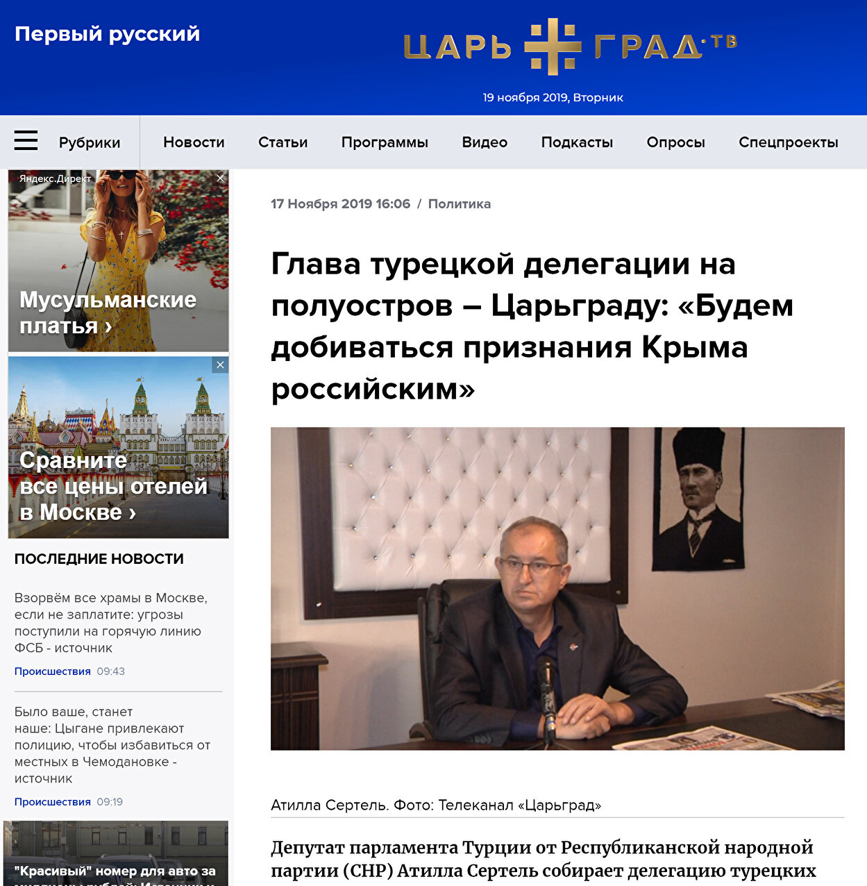 Kremlin'den gelen davet üzerine beraberindeki heyetle işgal altındaki Kırım'a gitmeyi kabul eden CHP Milletvekili Atila Sertel, Rus basınına konuştu. Tsagrad adlı internet sitesinde "Yarımada'ya gelecek Türk heyetinin başı: Kırım'ın Rusya'ya ait olduğunu tanıyacağız" başlığıyla yayımlanan o röportajda Sertel, ilginç açıklamalarda bulundu.