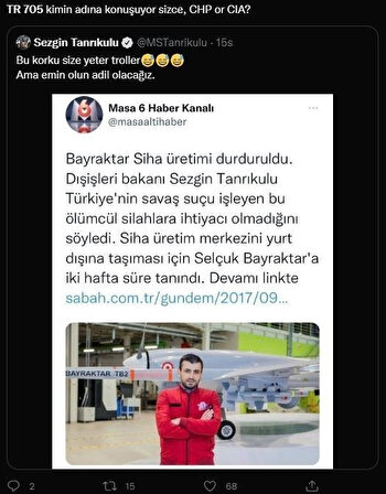 CHP'li vekilin yaptığı paylaşımda, "Bayraktar SİHA üretimi durduruldu. Dışişleri Bakanı Sezgin Tanrıkulu Türkiye'nin savaş suçu işleyen bu ölümcül silahlara ihtiyacı olmadığını söyledi. SİHA üretim merkezini yurt dışına taşıması için Selçuk Bayraktar'a iki hafta süre tanındı." gibi gerçek dışı akılalmaz ifadeler yer aldı.