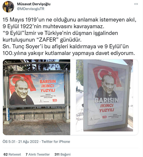 İzmir Büyükşehir Belediyesi, İzmir'in düşman işgalinden kurtuluşunun 100. yılı olan 9 Eylül için hazırladığı afişte "Barışın ikinci yüzyılı" ifadelerini kullandı. Afişten rahatsız olan İYİ Parti Grup Başkanvekili Müsavat Dervişoğlu, kaldırılması için İzmir Büyükşehir Belediye Başkanı Tunç Soyer'e çağrıda bulundu. Dervişoğlu, "15 Mayıs 1919’un ne olduğunu anlamak istemeyen akıl, 9 Eylül 1922’nin muhtevasını kavrayamaz." sözleriyle de tepkisini dile getirdi.