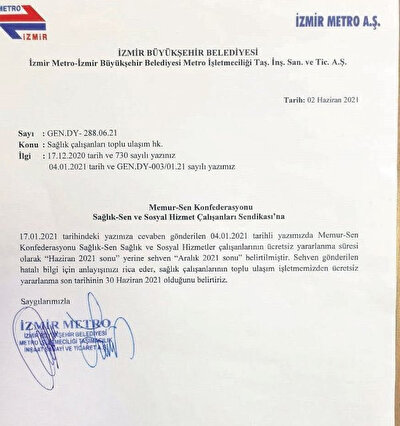 İzmir Metro-İzmir Büyükşehir Belediyesi İşletmeciliği Taş. İnş. San. Ve Tic. A.Ş. tarafından, Memur-Sen Konfederasyonu ile Sağlık-Sen Sağlık ve Sosyal Hizmetler Çalışanları Sendikası’na bildirilen kararda,