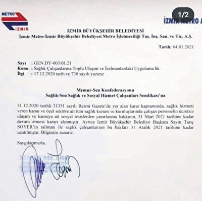 İzmir Büyükşehir Belediye Başkanı Tunç Soyer, koronavirüs salgınıyla mücadelede en ön safta mücadele eden sağlık çalışanlarının toplu ulaşımlardan yıl sonuna kadar ücretsiz yararlanmasını öngören kararı, 4 Ocak 2021 tarihinde imzalamıştı.