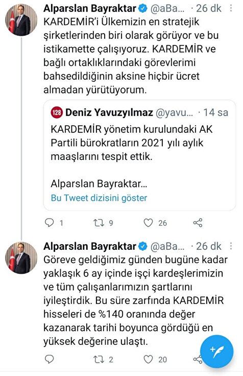Enerji ve Tabii Kaynaklar Bakan Yardımcısı Alparslan Bayraktar, CHP Zonguldak Milletvekili Deniz Yavuzyılmaz'ın kendisini hedef alan sözlerine cevap verdi. Bayraktar, "Kardemir ve bağlı ortaklıklarındaki görevlerimi bahsedildiğinin aksine hiçbir ücret almadan yürütüyorum" dedi.