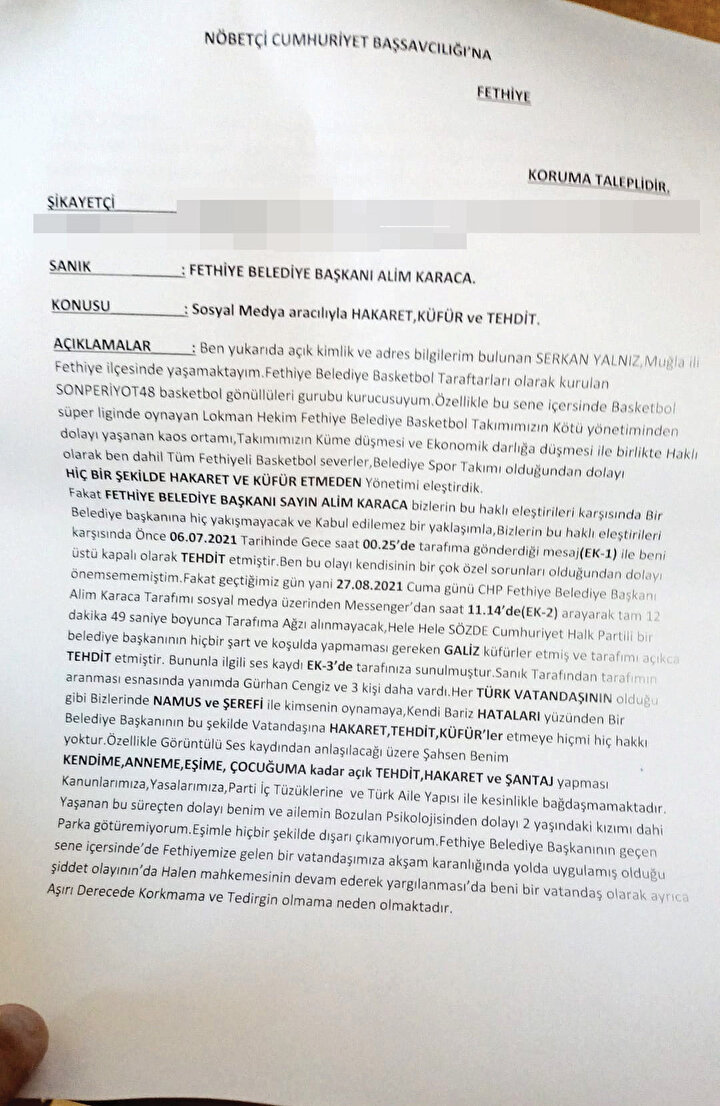 Yeni Şafak’ın ulaştığı bilgiye göre Lokman Hekim Fethiye Belediyespor’un basketbol takımının taraftarı olan Serkan Yalnız, sosyal medya üzerinden kulübün kötü yönetildiğini belirterek eleştirilerde bulundu. Belediyenin kulübe sahip çıkmasını isteyen Yıldız, takımın kapanma sürecine girdiğini belirterek duruma bir an önce el konulmasını istedi. Bunun üzerine Alim Karaca daha önce birkaç kez görüştüğü Serkan Yalnız’a 6 Temmuz’da mesaj atarak “Bu işlere burnunu sokma” diyerek tehdit etti.