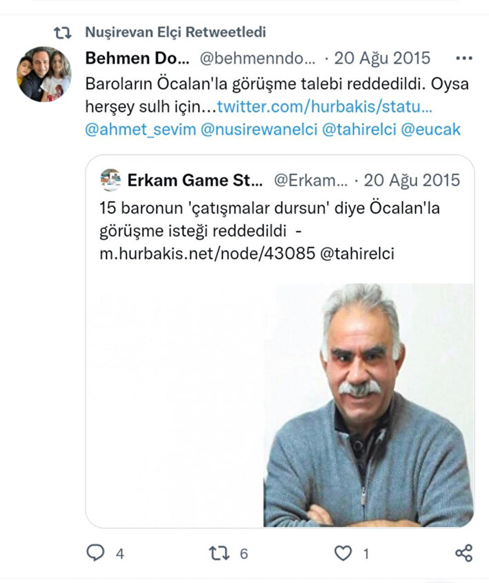 Türkiye'ye 'eksiksiz demokrasi' getireceğini ifade eden Elçi'nin terör örgütü PKK'ya destek paylaşımları ortaya çıktı. Sosyal medya hesabından PKK elebaşı Öcalan'ın fotoğraflarının bulunduğu paylaşımlar yapan Elçi'nin örgüte desteğini gizlemediği görüldü.