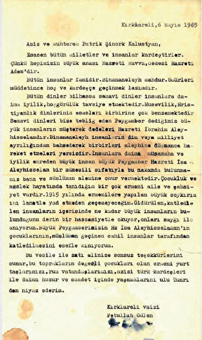 - Gülen’in bu mektubu Ermeni Patrik’i çok memnun etti. Gülen’e mektup yazan Kalusyan, Türkiye’ye böyle vaizlere ihtiyaç olduğunu ifade etti. Patrik, ‘Pek muhterem Fetullah Gülen’ hitabıyla başlayan, ‘Duacınız Şinork Kalusyan’ diyerek sonlanan mektubunda şunları kaydetti: “Aziz yurdumuzda sizin gibi doğru düşünen ve doğru muhakeme eden kıymetli vaizlerimiz bulundukça kardeşlik bağlarının payidar olacağına imanım kavidir.”