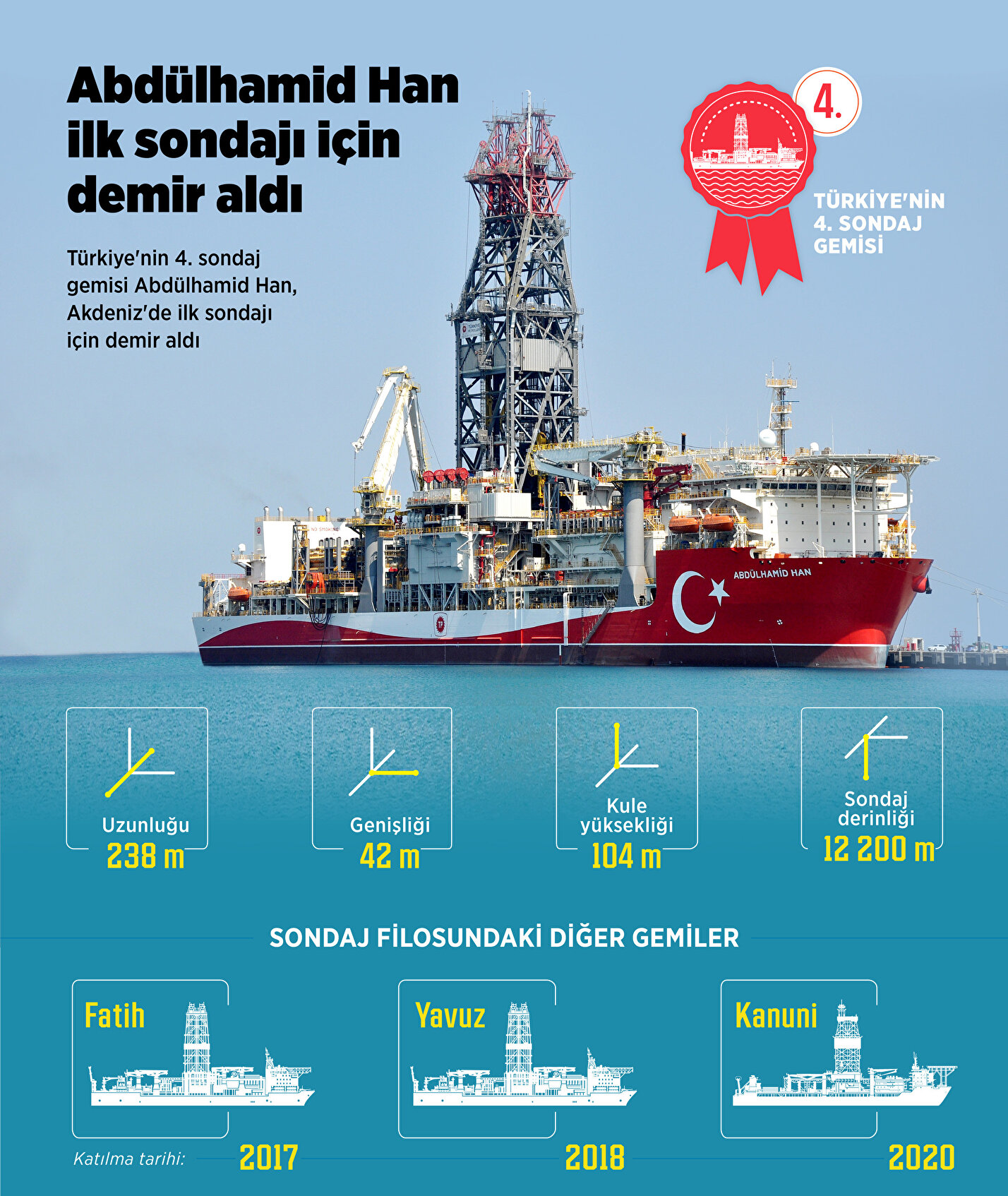 Türkiye'nin 4. sondaj gemisi Abdülhamid Han göreve başlıyor. Cumhurbaşkanı Erdoğan, Abdülhamid Han Sondaj Gemisini ilk görev yerine uğurlama töreninde konuştu. Cumhurbaşkanı Erdoğan, ''Sondaj gemimiz enerji vizyonumuzun göstergesi. 4 sondaj, 2 sismik araştırma gemimizle artık biz de bu alanda varız. Enerjide dışa bağımlılığı kendi kaynaklarımızla çözüyoruz. Deniz altında bir enerji üssü kuruyoruz. Üzeri kapatılmış kuyuları da üretime dahil ediyoruz. Abdülhamid Han gemimizi, yeni sondaj rotamız Akdeniz'e yolcu ediyoruz. Abdülhamid Han gemimizi, yeni sondaj rotamız Akdeniz'e yolcu ediyoruz. Abdülhamid Han sondaj gemimiz, Türkiye'nin enerji alanındaki yeni vizyonunun sembolüdür. 'Abdülhamid Han'ı Yörükler-1 kuyusuna göndereceğiz'' açıklamasında bulundu.