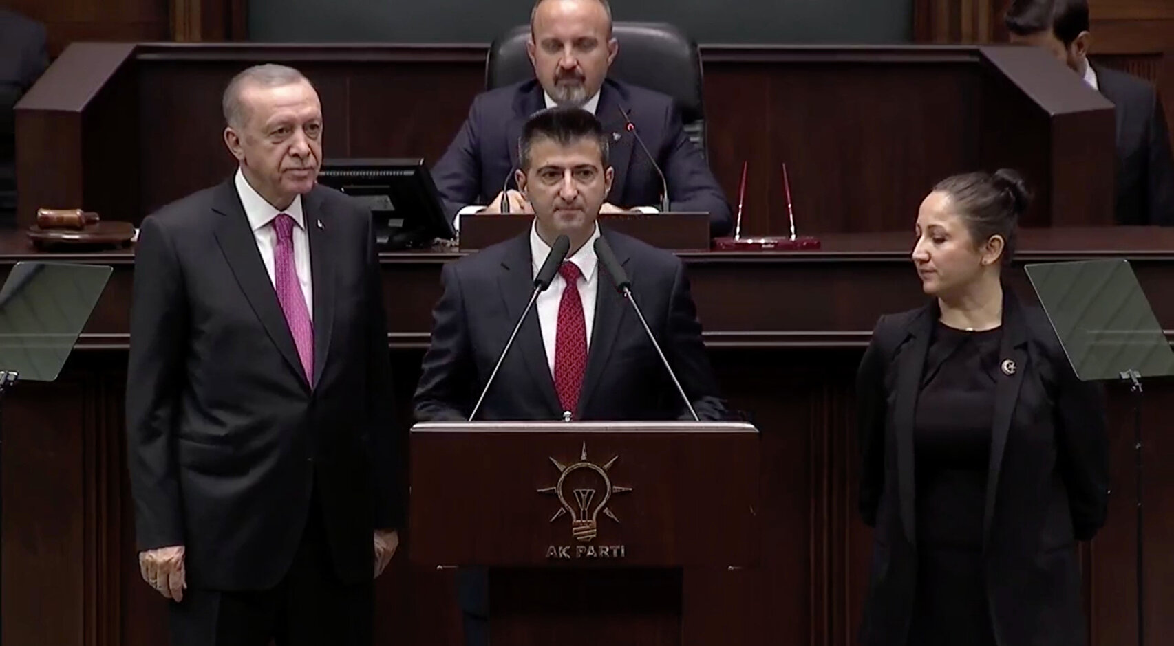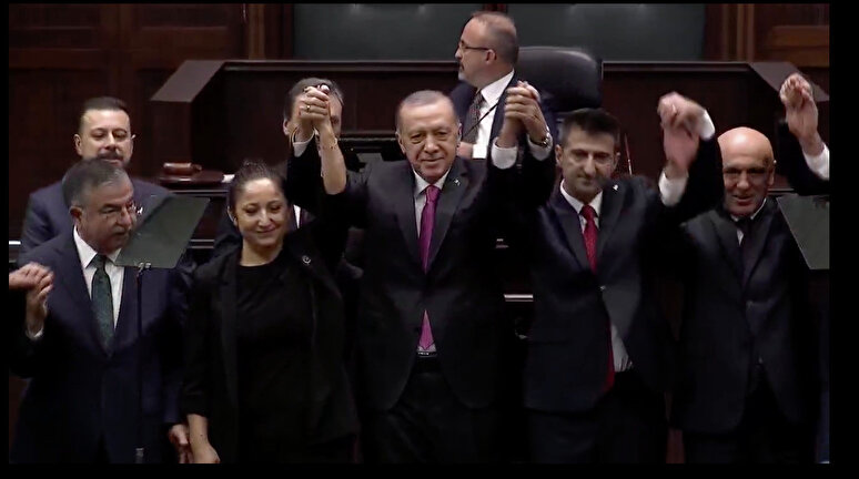 Cumhurbaşkanı Recep Tayyip Erdoğan, AK Parti Grup Toplantısı'nda, partiye yeni katılan İzmir Milletvekili Mehmet Ali Çelebi'nin rozetini taktı. Çelebi daha sonra AK Parti heyeti birlikte poz verdi.