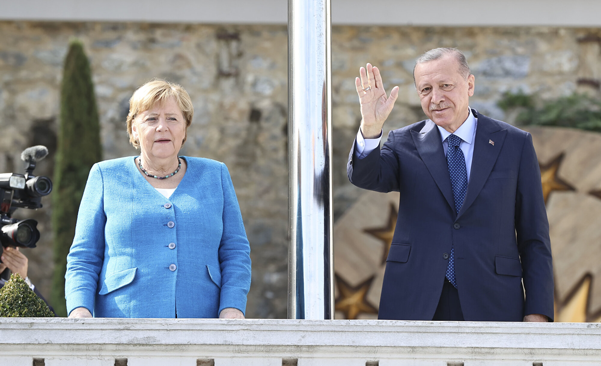 Türkiye ve Almanya bayrağının yanında duran iki lider, burada bekleyen yerli ve yabancı çok sayıda gazeteciyi selamladı.