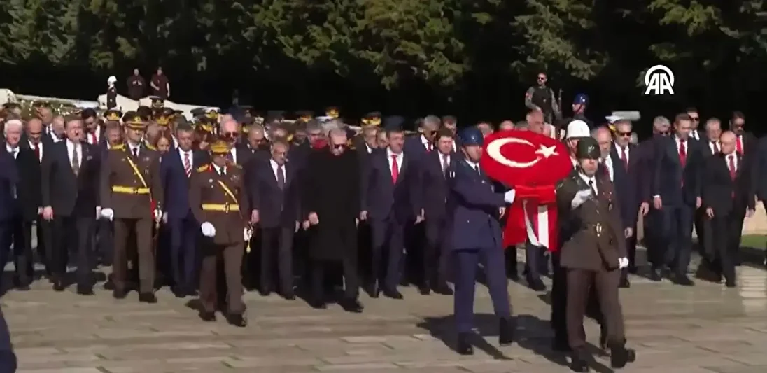 29 Ekim Cumhuriyet Bayramı dolayısıyla Cumhurbaşkanı Recep Tayyip Erdoğan başkanlığındaki devlet erkanı, Anıtkabir'i ziyaret ediyor. Cumhurbaşkanı Erdoğan devlet protokolüyle birlikte Atatürk'ün mozolesine çelenk bıraktı.