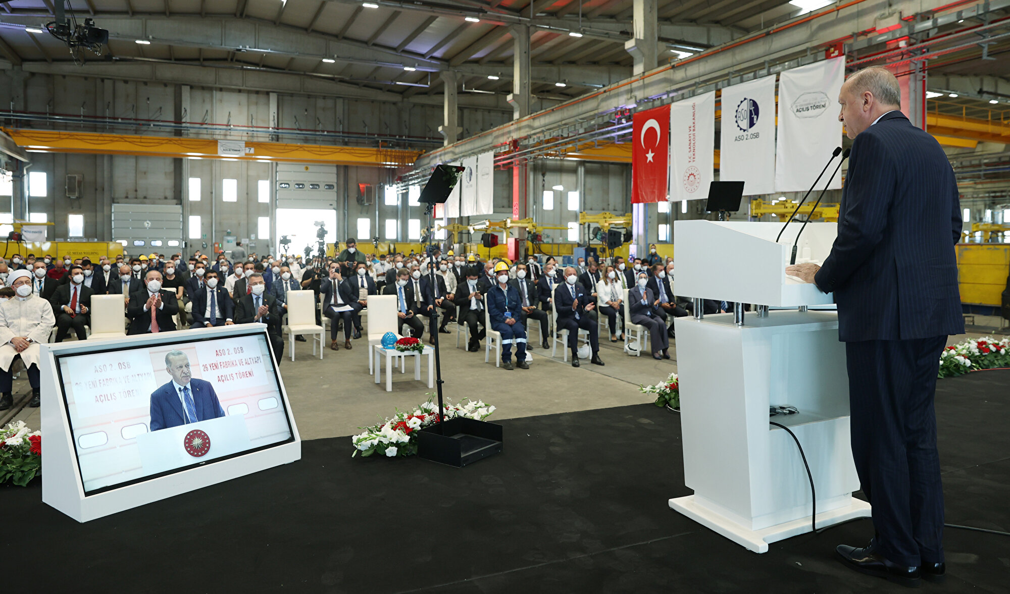 Bu sanayi bölgesinin temelini 2005 yılı şubat ayında bizzat attığını anımsatan Erdoğan, "Türkiye'nin kapasitesini, Türk sanayisinin gücünü görmek isteyenleri, sırça köşklerinden ahkam kesmek yerine gelip burayı ziyaret etmeye davet ediyorum. Rabbimden, savunma sanayinden otomotive, elektronikten talaşlı imalata kadar farklı alanlarda üretim yapacak bu fabrikalarımızın vatanımıza ve milletimize hayırlı olmasını diliyorum. Bu yatırımlarımızın Türkiye'ye kazandırılmasında emeği geçen Sanayi ve Teknoloji Bakanımızı ve ekibini, OSB yönetimini, elbette iş dünyamızın babayiğitlerini canı gönülden tebrik ediyorum. Türkiye; siyaset, demokrasi, diploması yanında ekonomide de köklü bir dönüşümden geçiyor. Marshall Yardımlarından beri küresel üretim ağının çeperinde tutulan ekonomimiz uzun yıllar sonra ilk defa kendi mecrasını yine kendi gücüyle buluyor. İhracat ve sanayi başta olmak üzere tüm temel veriler Türk ekonomisinde yaşanan bu tarihi değişimi ortaya koyuyor. Dünya ekonomisinin yüze 3 küçüldüğü, küresel ticaretin yüzde 10'a yakın daraldığı 2020 yılında biz yüzde 1,8 büyüme kaydettik. Bu oranla G-20 ülkeleri arasında ikinci sırada yer aldık. Aynı şekilde 2021 yılının ilk çeyreğinde yüzde 7'lik büyümeyi yakaladık. İnşallah ikinci çeyreği de ciddi bir büyüme ile kapatacağız. Özellikle sanayi ve üretim tarafından güzel haberler alıyoruz. Sanayi üretimi haziran ayı itibariyle çeyreklik bazda yüzde 41, yıllık bazda ise yüzde 24 artış gösterdi" diye konuştu.