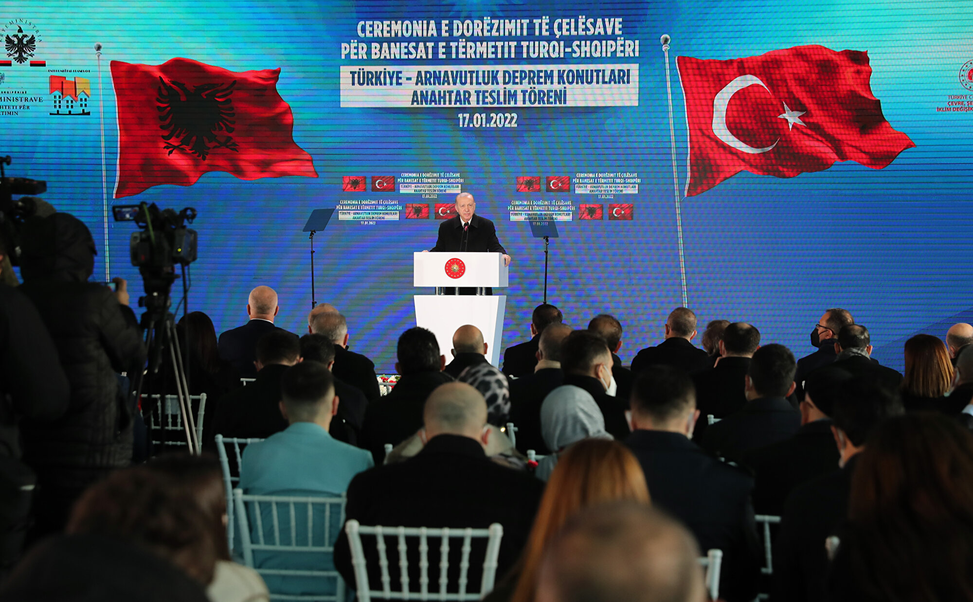 Sahadaki bu yardımların yanı sıra Arnavut halkının yükünü bir nebze olsun hafifletmek için yıkılan konutların yerine yenilerini inşa etme kararı aldıklarını anlatan Erdoğan, Temmuz 2020'de gerekli mutabakat zaptının imzalandığını ve koronavirüs salgınına rağmen aralıkta inşaatlara başlandığını hatırlattı.
