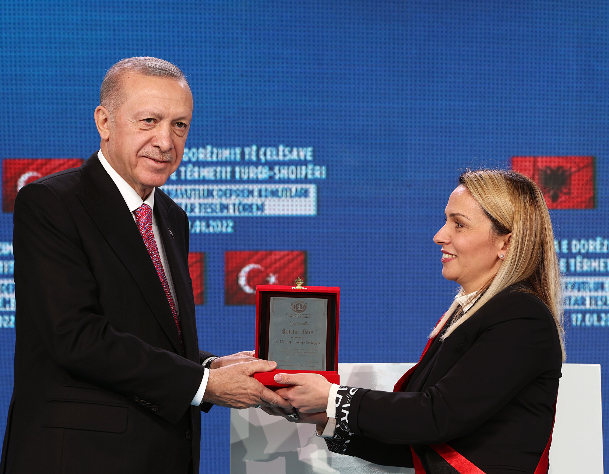 - Tören vesilesiyle burada bulunanların heyecanına, coşkusuna ortak olmaktan duyduğu mutluluğu dile getiren Erdoğan, "Arnavutluk'un sevinci sevincimiz, sıkıntısı da bizim sıkıntımızdır. Sizlerin huzur ve esenliğini kendimizinkinden ayrı tutmuyoruz. Aynı acıları daha önce pek çok kez yaşamış bir ülkenin insanları olarak, 21 Eylül ve 26 Kasım 2019 tarihlerinde meydana gelen depremler Arnavut halkı kadar bizim de yüreğimizi dağlamıştır." diye konuştu.