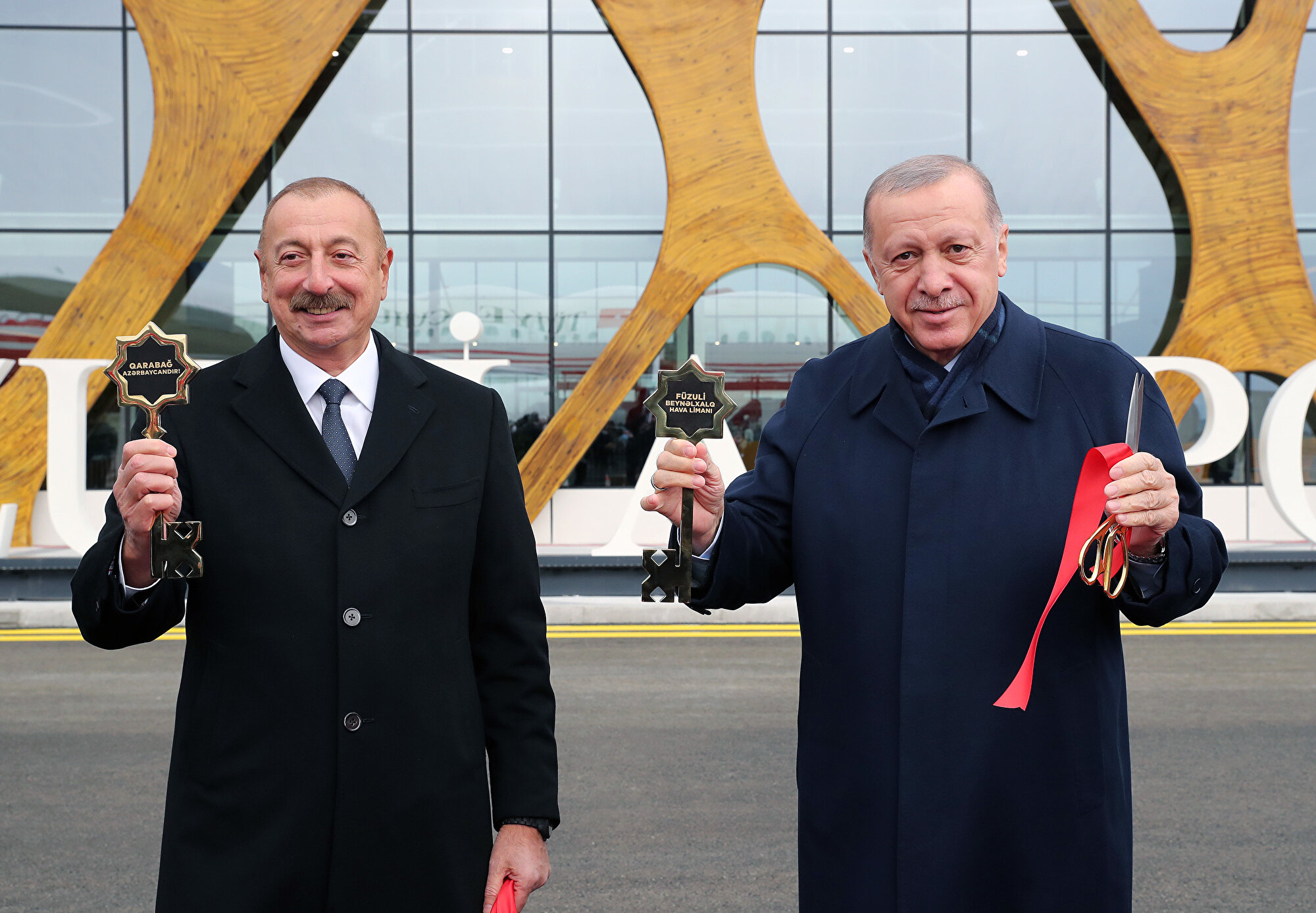 - Erdoğan, Fuzuli Uluslararası Havalimanı’na inen ilk cumhurbaşkanı olurken, kendisini karşılayan Azerbaycanlı mevkidaşı İlham Aliyev ile birlikte havalimanının açılışını gerçekleştirdi.