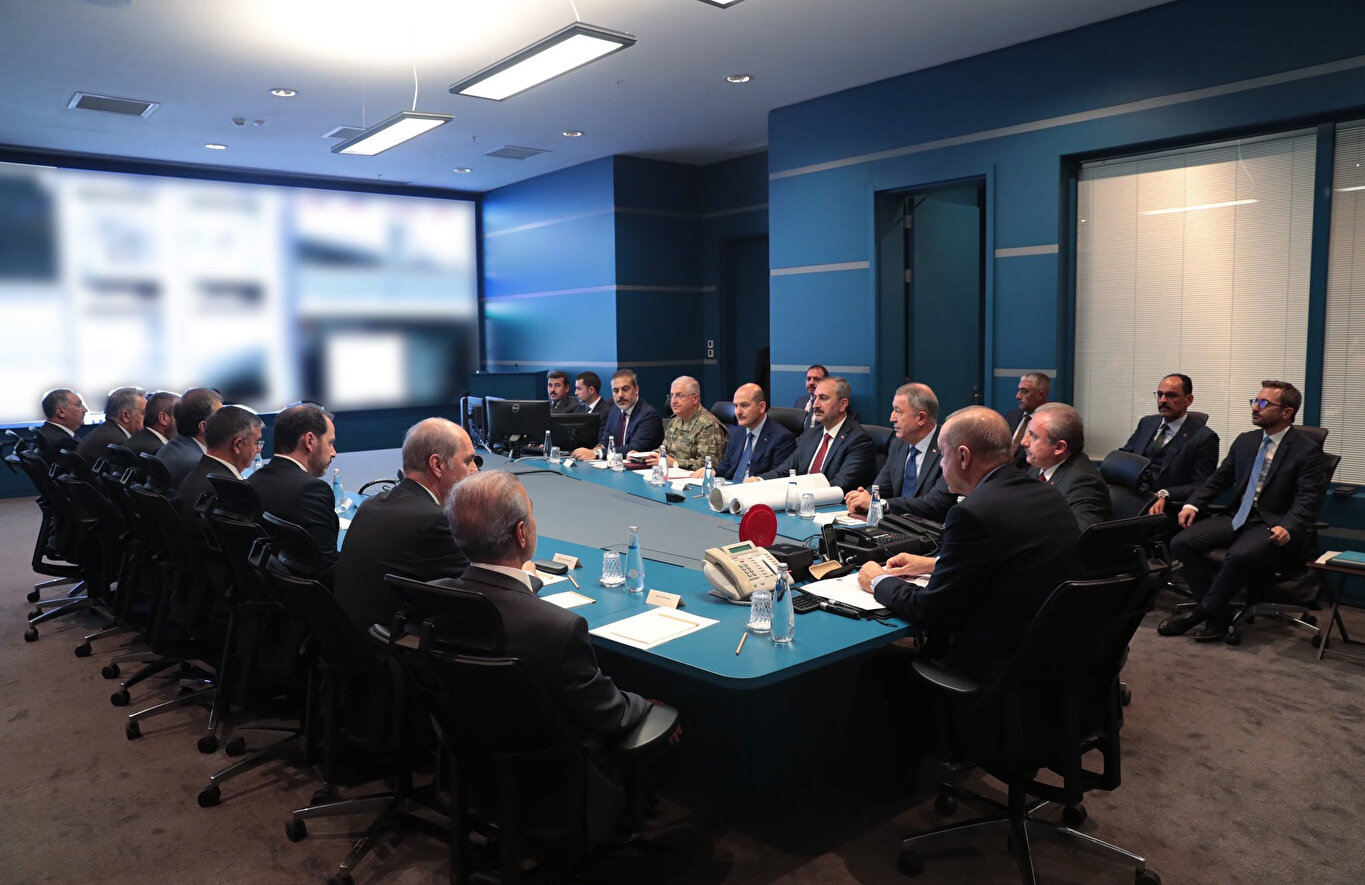 Cumhurbaşkanlığı Külliyesi'ndeki toplantıya, TBMM Başkanı Mustafa Şentop, Adalet Bakanı Abdulhamit Gül, Hazine ve Maliye Bakanı Berat Albayrak, İçişleri Bakanı Süleyman Soylu, Milli Savunma Bakanı Hulusi Akar, TBMM AK Parti Grup Başkanı Naci Bostancı, TBMM Milli Savunma Komisyonu Başkanı İsmet Yılmaz, Genelkurmay Başkanı Orgeneral Yaşar Güler, MİT Başkanı Hakan Fidan, AK Parti Genel Başkanvekili Numan Kurtulmuş, AK Parti Genel Başkan Yardımcıları Hayati Yazıcı, Mahir Ünal, AK Parti Sözcüsü Ömer Çelik, İletişim Başkanı Fahrettin Altun, Cumhurbaşkanlığı Sözcüsü İbrahim Kalın katıldı.