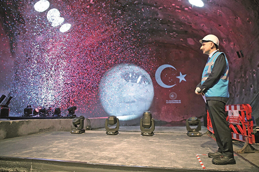 Cumhurbaşkanı Erdoğan, konuşmasının ardından tünel ışığını görmek için direktif verdi. Ulaştırma ve Altyapı Bakanı Adil Karaismailoğlu da kazı işlemini gerçekleştiren tünel açma makinası TBM’in (Tunnel Boring Machine) özellikleri hakkında bilgi verdi. Erdoğan, TBM’nin çalışması öncesinde tünelde adeta dolunay gibi bir görüntünün oluştuğunu dile getirerek, halk arasında TBM için “köstebek” ifadesinin çok kullanıldığını, TBM’yi anlatırken bu noktada biraz zorlandıklarını ifade etti. Tünel kazı işlemlerini bununla bitireceklerini ama işin devam edeceğini belirten Erdoğan, Bakan Karaismailoğlu’na geri sayım için kaç saniye kaldığını sordu. Bakan Karaismailoğlu, “Şu an bitmek üzere. 30 saniye Sayın Cumhurbaşkanım. Birazdan hareketlenmeye başlayacak duvar.” yanıtını verdi. Erdoğan’ın, “Bakan Bey, demin de 30 dedin.” demesi üzerine Karaismailoğlu, “Doğru diyorsunuz, ben de arkadaşlarımın yalancısıyım Sayın Cumhurbaşkanım. Ama biz makinenin sesini duyuyoruz. Arkada hummalı bir çalışma var?” dedi. Bunun üzerine Erdoğan, Bakan Karaismailoğlu’na, “Çok heyecanlandığının farkındayım.” diyerek espiri yaptı. Cumhurbaşkanı Erdoğan, Bakan Karaismailoğlu’na “Şu anda 70 metre yerin altındasınız değil mi?” diye sordu. Bakan Karaismailoğlu, “Aynen, burası Gayrettepe Sayın Cumhurbaşkanım. Tam E-5-Zincirlikuyu Kavşağı’nın altındayız. Bu istasyonla birlikte Hacıosman-Yenikapı Metro Hattı ile entegrasyonu olan bir istasyonumuz olacak.” yanıtını verdi. Tüneldeki çatlama anını büyük bir ilgiyle izleyen Cumhurbaşkanı Erdoğan, “TBM, köstebek göründü. Maşallah.” diyerek, bu tarihi anı alkışladı.