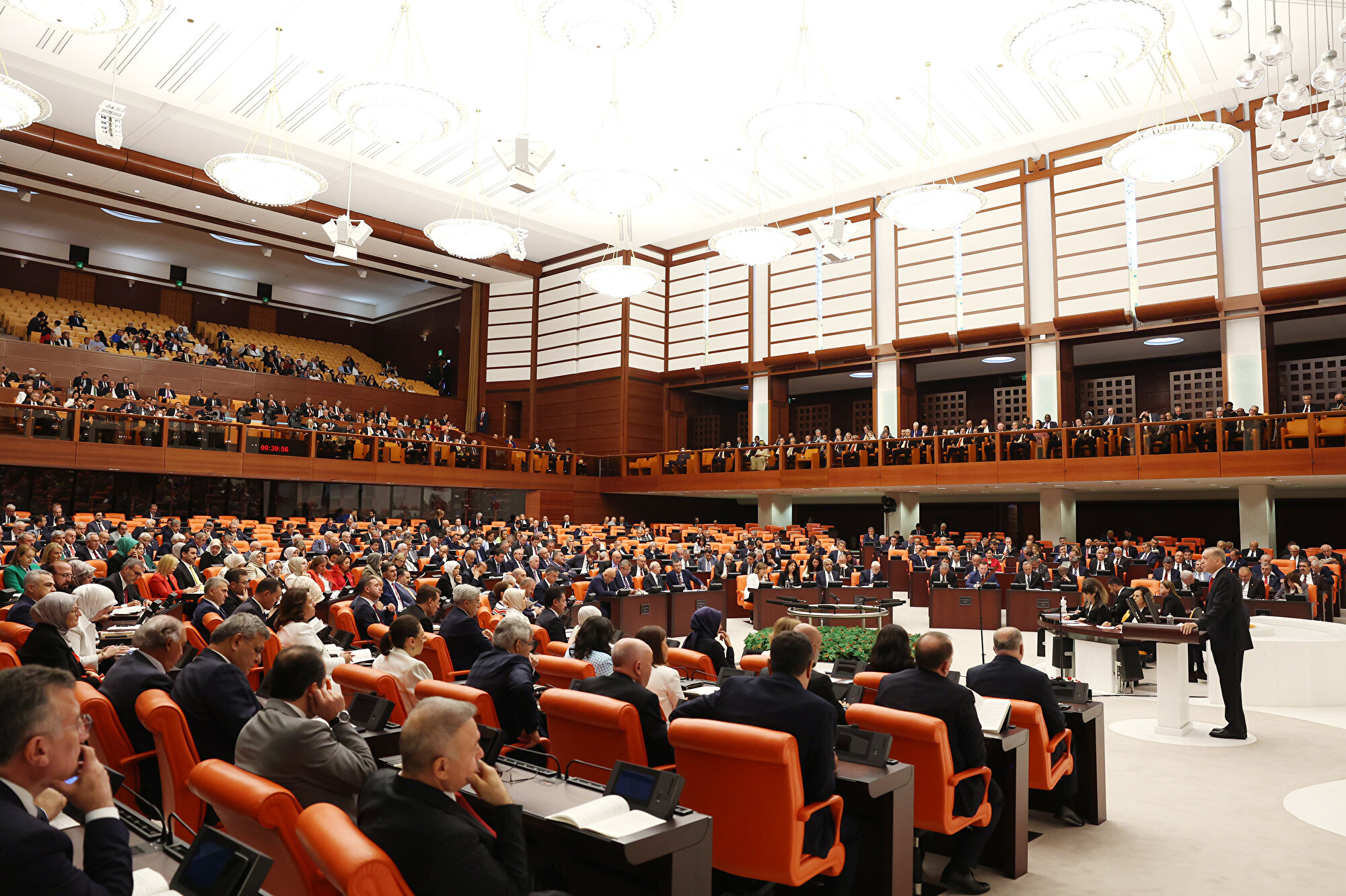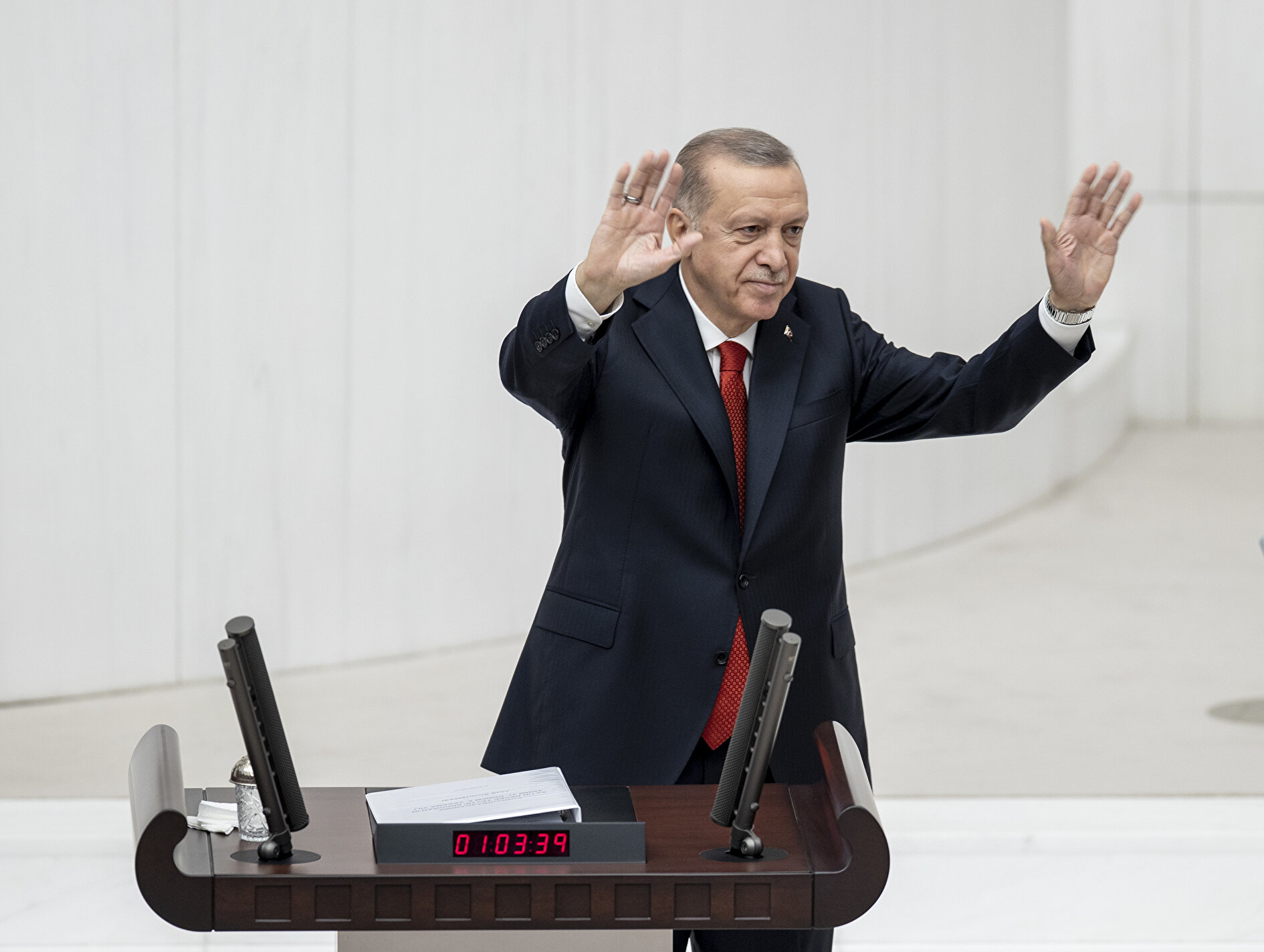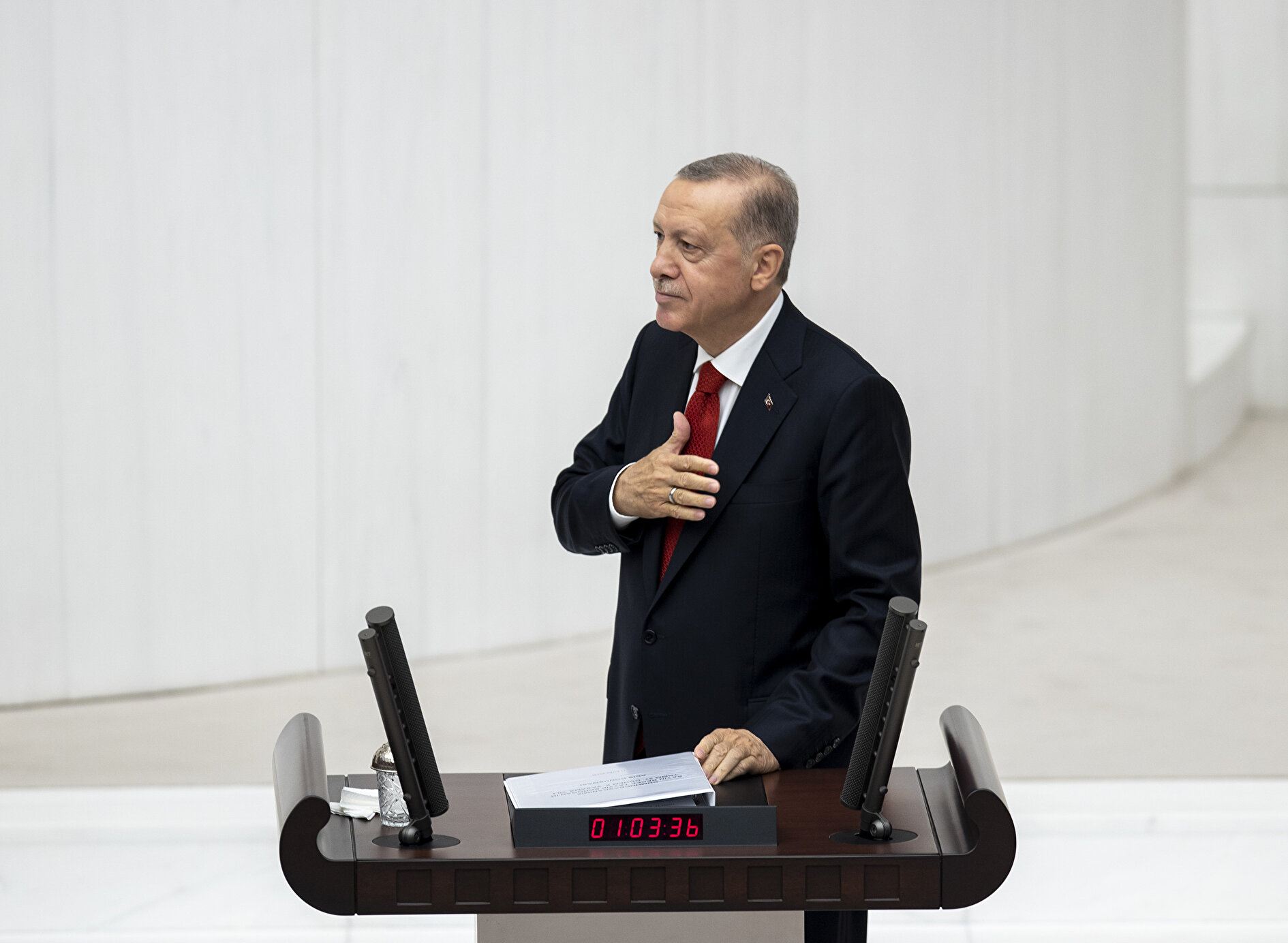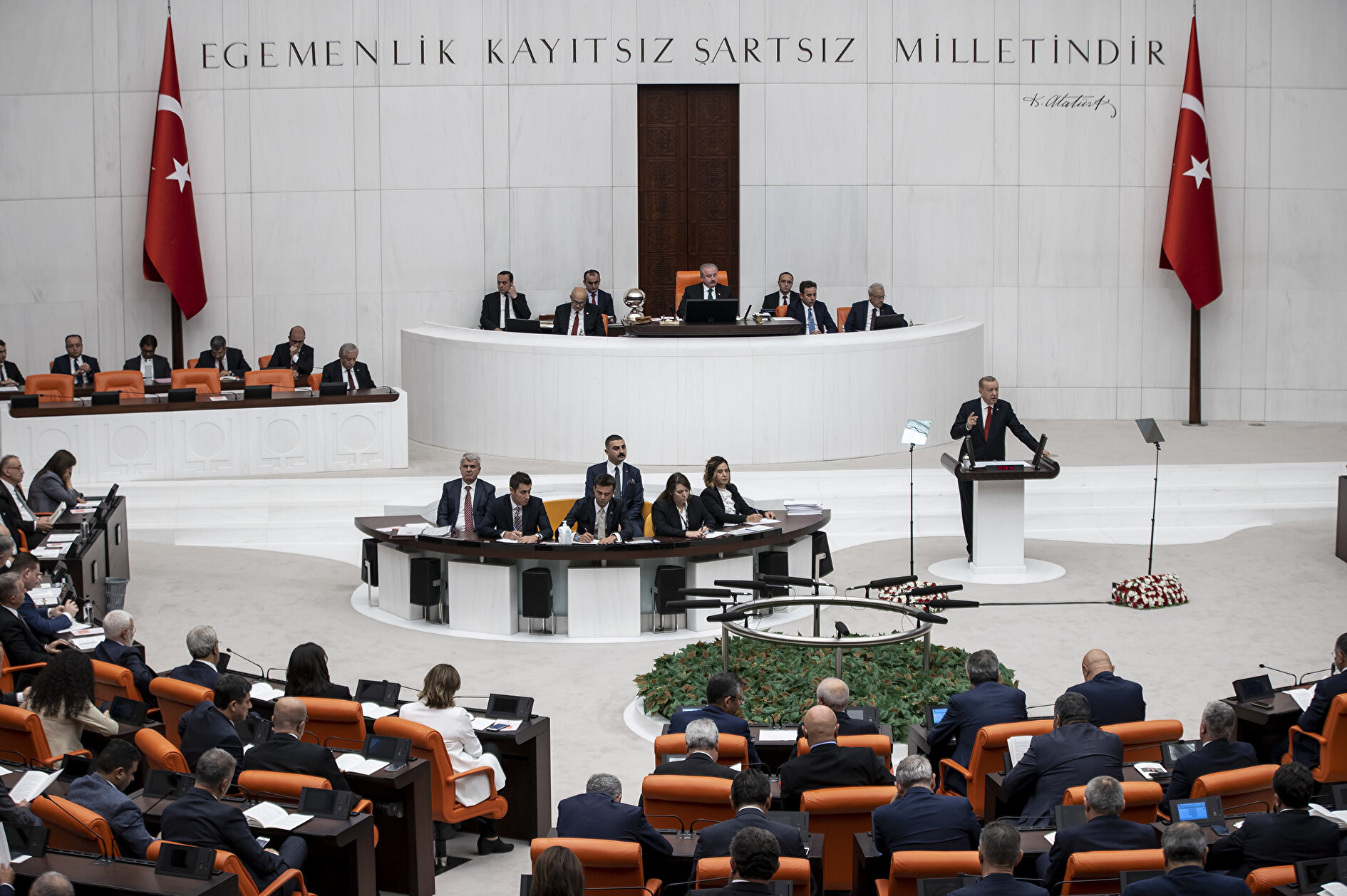 Genel Kurulda bando eşliğinde İstiklal Marşı'nın okunmasının ardından Erdoğan konuşmasını yapmak üzere kürsüye çıktı. Erdoğan, bu sırada bir süre ayakta alkışlandı.