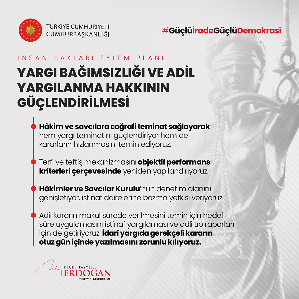 Hukuk devletinin bağımsız, tarafsız bir mahkemelerin varlığı ile vücut bulacağı inancıyla yeni adımlar atıyoruz. Kararların adil olmasının yanında makul sürede verilmesi gerekiyor. Terfi ve teftiş mekanizmasını kararların yeterli gerekçeyle yazılıp yazılmadığı gibi objektif performans kriterleri çerçevesinde yeniden yapılandırıyoruz. Yargı kararlarında da dilimizin en yüksek temsilini bekliyoruz. Yargı kararlarının anlaşılabilir olmasına ilişkin meslek öncesi ve meslek içi faaliyetlerini arttırıyoruz. HSK'nın denetim alanını genişletiyoruz.