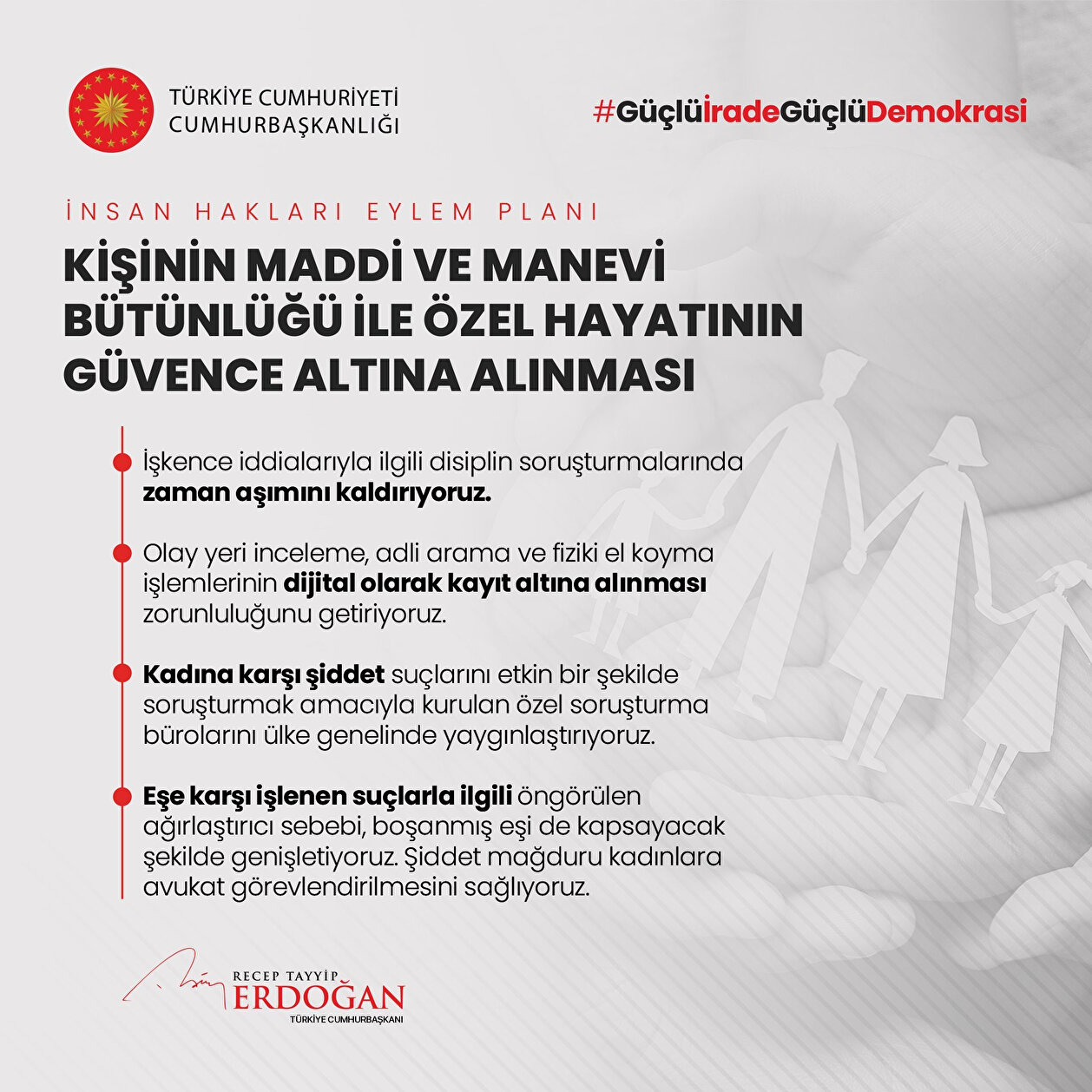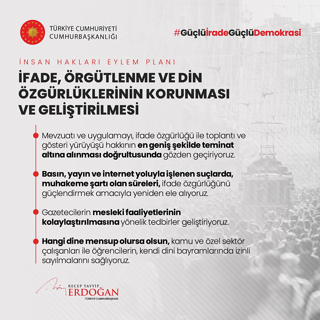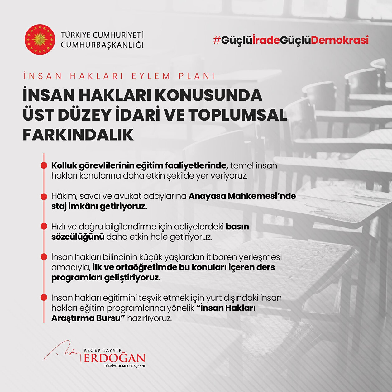 Cumhurbaşkanı Recep Tayyip Erdoğan, Beştepe Millet Kongre ve Kültür Merkezi'nde İnsan Hakları Eylem Planı Tanıtım Toplantısında konuştu. Erdoğan, “Vizyonu, ‘Özgür birey, güçlü toplum; daha demokratik bir Türkiye’ olarak belirlenen Eylem Planımız, 11 temel ilkeyle başlıyor. Bu sürecin sonunda 9 amaç, 50 hedef, 393 faaliyeti içeren bir belge olarak ortaya çıktı. 2 yıllık bir zaman diliminde uygulanmak üzere hazırlanmıştır” dedi.