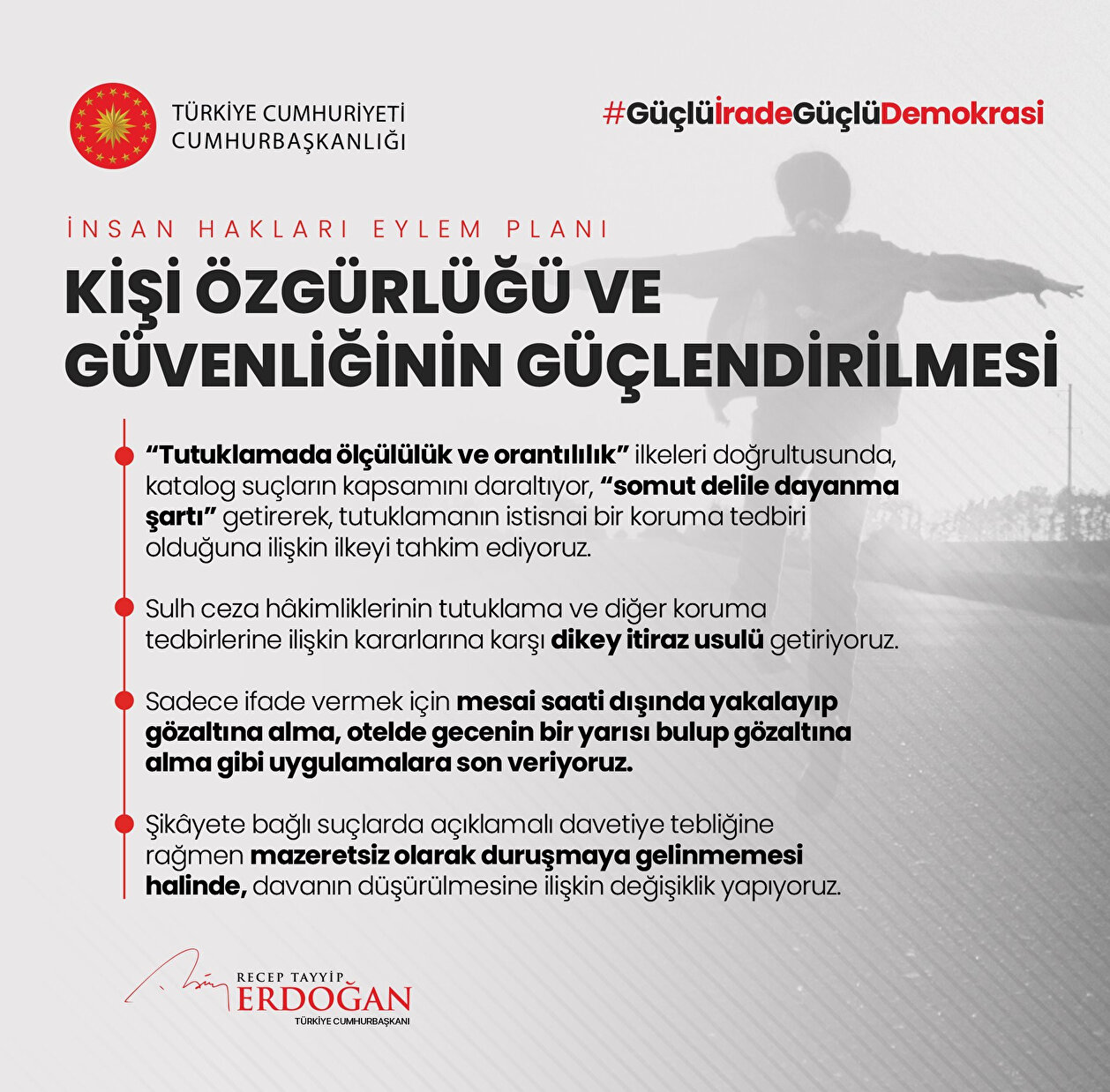 Eylem Planı'nın 5. amacı kişi özgürlüğü ve güvenliğinin güçlendirilmesidir. Tutuklamanın bir koruma tedbiri olduğu yönünde mevzuatta önemli değişiklikler yaptık. Süresi, kapsamı, gerekçesi konusunda yapılan değişiklikler önemli bir iyileşme sağlamıştır. Tutuklamada ölçülülük ve orantılılık kapsamında katalog suçlarının kapsamını daraltıyoruz. Sulh ceza hakimliklerinin tutuklama kararlarına karşı dikey itiraz usulü getiriyoruz. ;Otelde gece yarısı gözaltına alma işlemlerine son veriyoruz. İfade alma işlemi 24 saat yapılacak. Mazeretsiz olarak duruşmaya gelinmemesi halinde davanın düşürülmesine ilişkin düzenleme yapıyoruz.