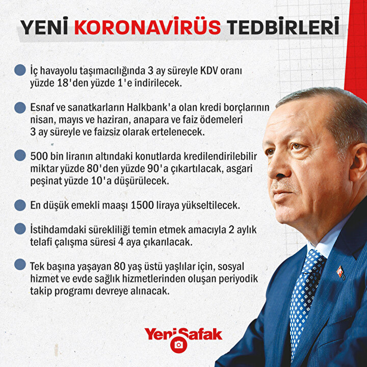 Cumhurbaşkanı Erdoğan koronavirüsle mücadele toplantısının ardından salgınla mücadele çerçevesinde atılması gereken adımları açıkladı. "Ekonomik İstikrar Kalkanı" adını verdiği ekonomi paketini kamuoyuna duyuran Cumhurbaşkanı Erdoğan, "En düşük emekli maaşını 1.500 liraya yükseltiyoruz. 500 bin liranın altındaki konutlarda kredilendirilebilir miktarını yüzde 80’den yüzde 90’a çıkartacak, asgari peşinatı yüzde 10’a düşüreceğiz. İç havayolu taşımacılığında 3 ay süreyle KDV oranını yüzde 18’den yüzde 1’e indiriyoruz. Perakende, AVM, Demir-Çelik, Otomotiv, Lojistik-Ulaşım, Sinema-Tiyatro, Konaklama, Yiyecek-İçecek, Tekstil-Konfeksiyon ve Etkinlik-Organizayon sektörleri için Muhtasar ve KDV tevkifatı ile SGK primlerinin Nisan, Mayıs ve Haziran ödemelerini 6’şar ay erteliyoruz." ifadelerini kullandı.
