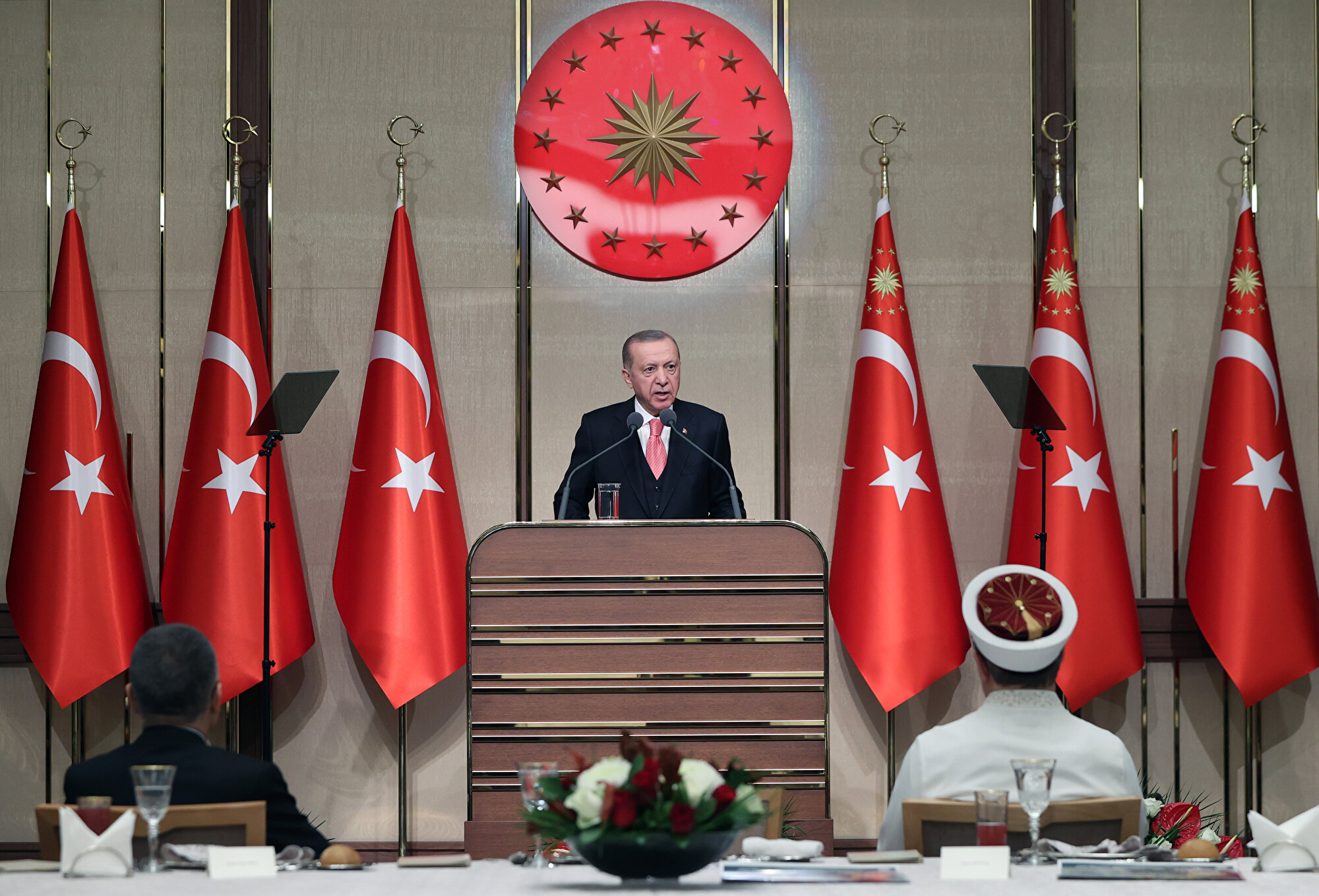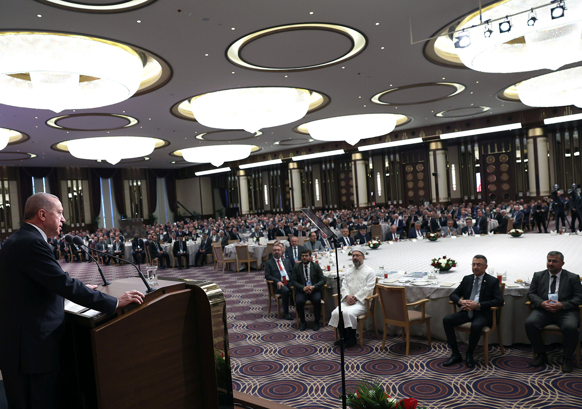 - "Diyanet teşkilatımızın çatısı altında, farklı kademelerde görev yapan tüm kardeşlerimizi hayra hizmet eden seçkin insanlar olarak görüyoruz. Buradaki her bir müftümüzün de vazifesine yüksek bir bilinçle, hademe-i hayrat olmanın şuuruyla yaklaştığını biliyorum. Hocalarımız, sadece cami kürsüsünde, minberde, mihrapta değil hayatımızın her safhasında yeri doldurulmaz roller üstleniyor. Dünyaya gözlerimizi açtığımız andan son nefesimizi verdiğimiz ana kadar yanımızda ailelerimizle birlikte hep hocalarımız, din adamlarımız var. Dolayısıyla sizlerin mesleğinin kıymeti ne makamla ne mevkiyle ne parayla ne şöhretle ölçülebilir. Sizler inancımızın 14 asırlık sahih geleneğini yaşatmak, bunları yeni nesillere aktarmakla milletimizin sırat-ı müstakim üzere yürümesini temin etmekle mükellef insanlarsınız. Gençlerimizin irşadı, bilgilendirilmesi, eğitim ve ibadet ihtiyaçlarının karşılanması konusunda en büyük sorumluluk size düşüyor. Hademe-i hayrat olmak, peygamberlerin varisi gibi bir payeyi layıkıyla taşımak her baba yiğidin harcı değildir. Bilhassa günümüzde bunun zorluklarını çok iyi biliyoruz. Sizler zahmetli ama bir o kadar da şerefli bir vazifeyi ifa ediyorsunuz."