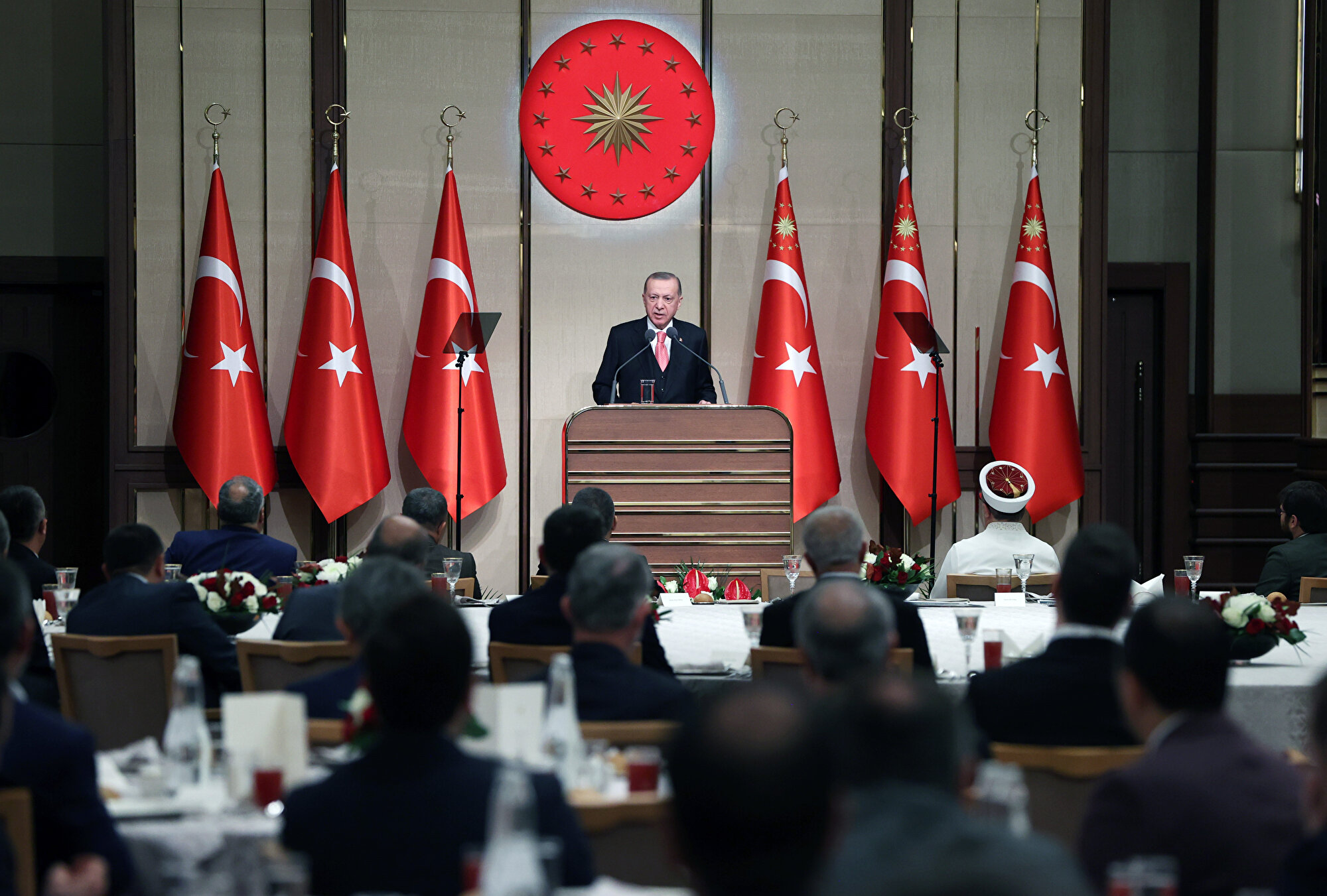 - Erdoğan, İlçe Müftüleri İstişare Toplantısı dolayısıyla Cumhurbaşkanlığı Beştepe Sergi Salonu'nda yaptığı konuşmasına, ülkenin 81 vilayetinde, 922 ilçesinde görev yapan diyanet camiasının tüm mensuplarına selamlarını ileterek başladı.