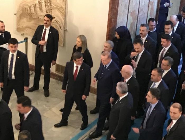 Cumhurbaşkanı Recep Tayyip Erdoğan, grup toplantısına eski Başbakan Ahmet Davutoğlu ile birlikte geldi.