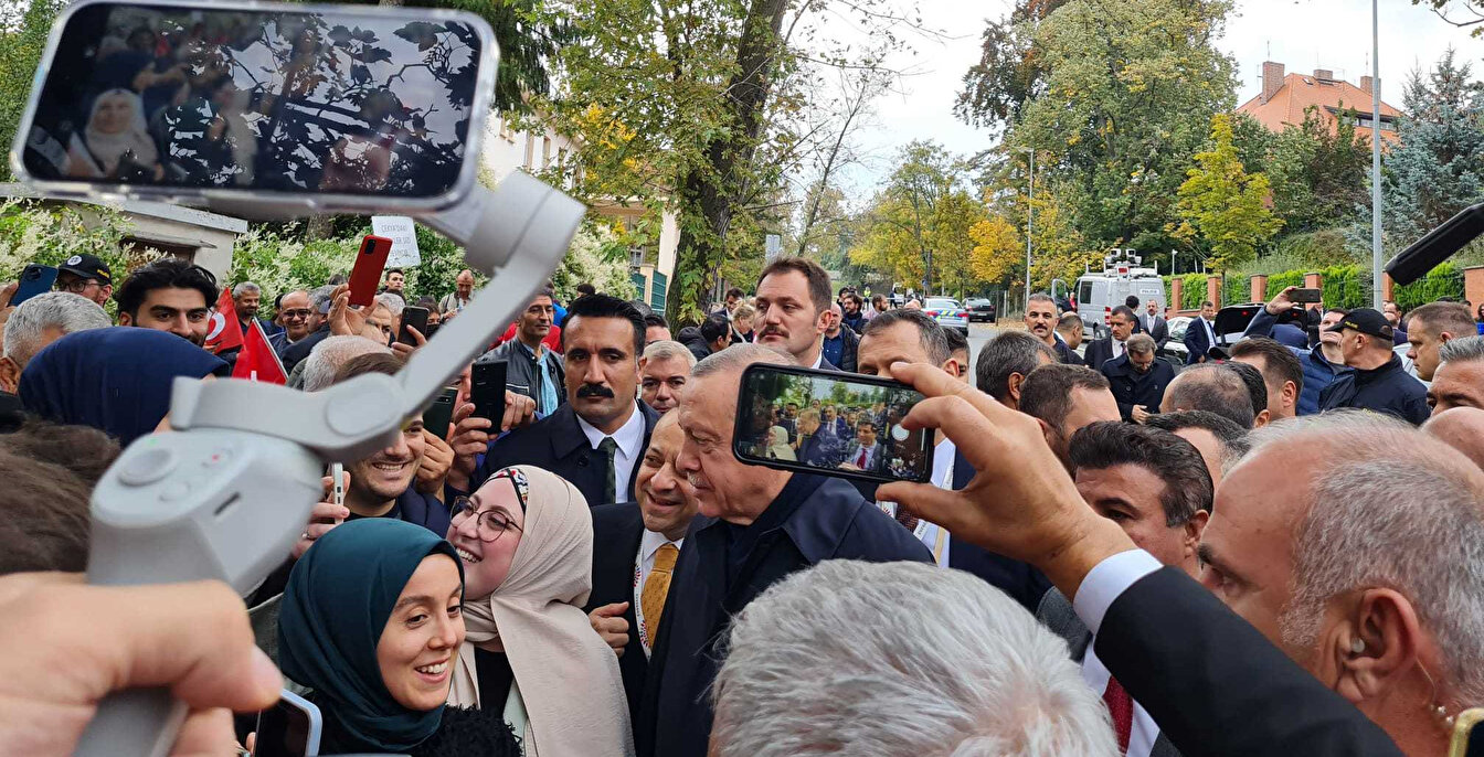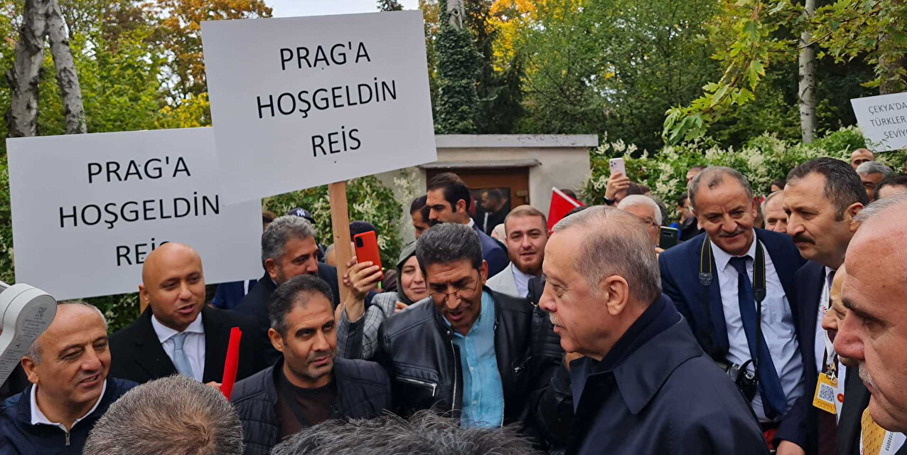 Prag'da ellerinde Türk bayraklarıyla kendisine sevgi gösterisinde bulunan gurbetçileri selamlayan Erdoğan, aracından inerek onlarla bir süre sohbet etti, fotoğraf çektirdi.