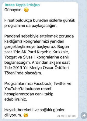 Cumhurbaşkanı Recep Tayyip Erdoğan, Telegram hesabından bir mesaj paylaştı. "Günaydın, sevgili kardeşim" ifadesiyle mesajına başlayan Erdoğan, "Fırsat buldukça buradan sizlerle günlük programımı da paylaşacağım" dedi. Erdoğan mesajında günlük programının detaylarına yer verdi.