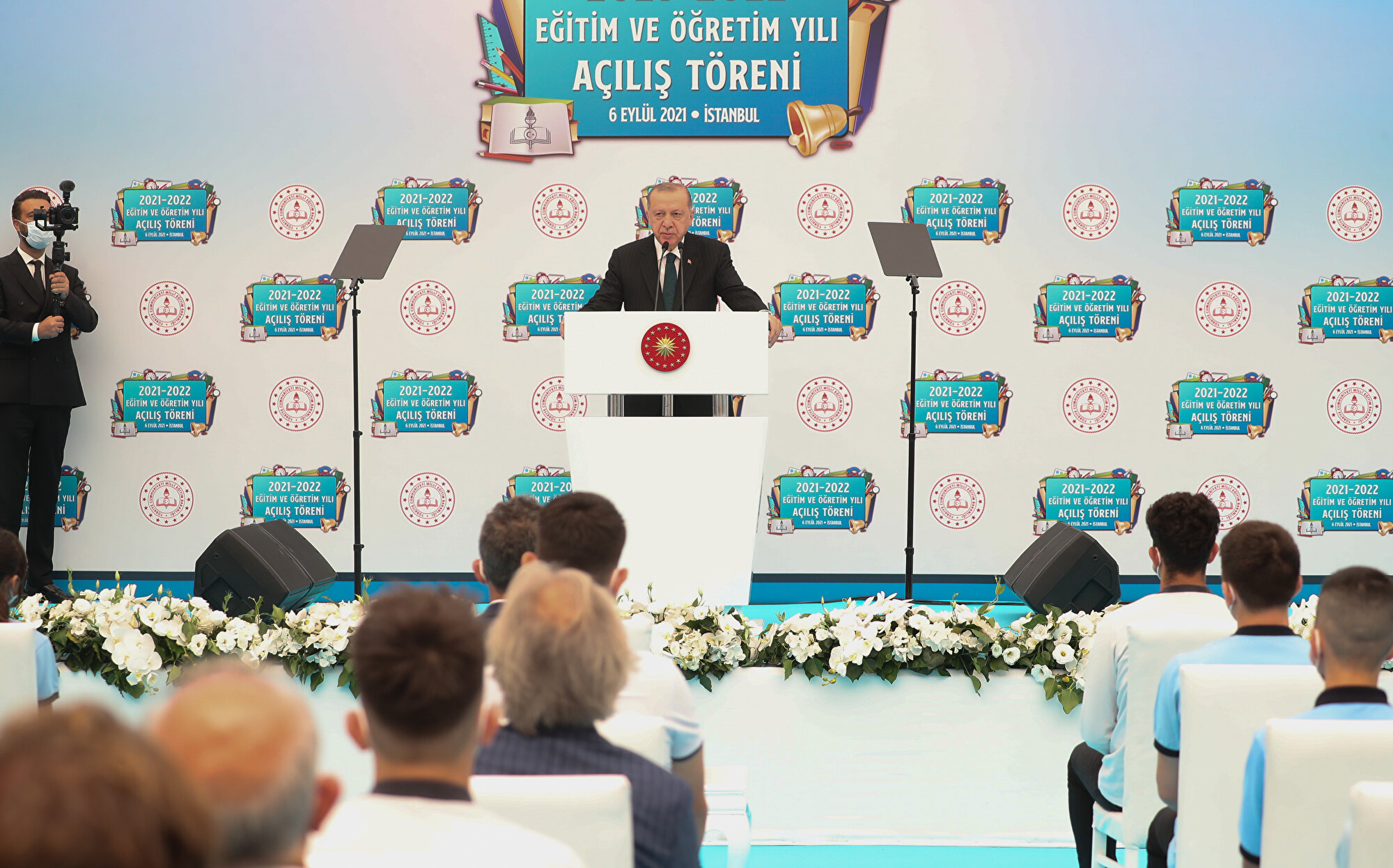 2021-2022 Eğitim Öğretim Yılı Açılış Programı’na Cumhurbaşkanı Erdoğan’ın yanı sıra Milli Eğitim Bakanı Mahmut Özer, Sanayi ve Teknoloji Bakanı Mustafa Varank, Cumhurbaşkanlığı İletişim Başkanı Fahrettin Altun, Cumhurbaşkanlığı Sözcüsü İbrahim Kalın, Cumhurbaşkanlığı Kültür ve Sanat Politikaları Kurulu Başkan Vekili ve yazar İskender Pala, İstanbul Valisi Ali Yerlikaya, AK Parti İstanbul İl Başkanı Osman Nuri Kabaktepe ve öğrenciler katıldı.