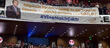(Salondaki pankart) Gençlik, ilginç bir noktayı yakalamış, "Gölgelerin üzerimize geldiği en zor zamanda güneşin doğuşuna binlerce kez şahit olduk. Yine haklı çıktın."