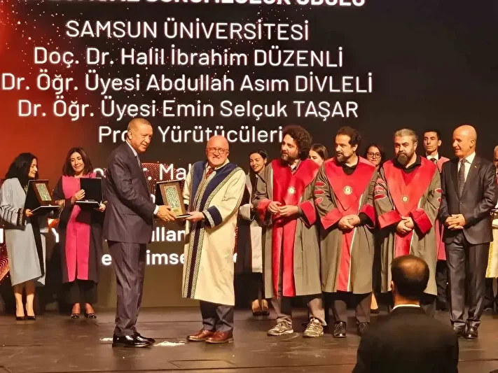 Cumhurbaşkanlığı Külliyesi’nde düzenlenen 2025–2026 Akademik Yılı Açılış Töreninde verilen ödüller, Cumhurbaşkanı Erdoğan ve YÖK Başkanı Prof. Dr. Erol Özvar’ın katılımıyla sahiplerini buldu. Törende Samsun Üniversitesi Rektörü Prof. Dr. Mahmut Aydın, proje yürütücüleri Doç. Dr. Halil İbrahim Düzenli, Dr. Öğr. Üyesi Abdullah Asım Divleli ve Dr. Öğr. Üyesi Emin Selçuk Taşar ile birlikte ödülü Cumhurbaşkanı Erdoğan’ın elinden aldı.