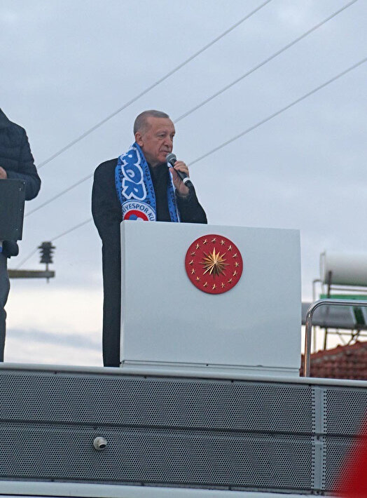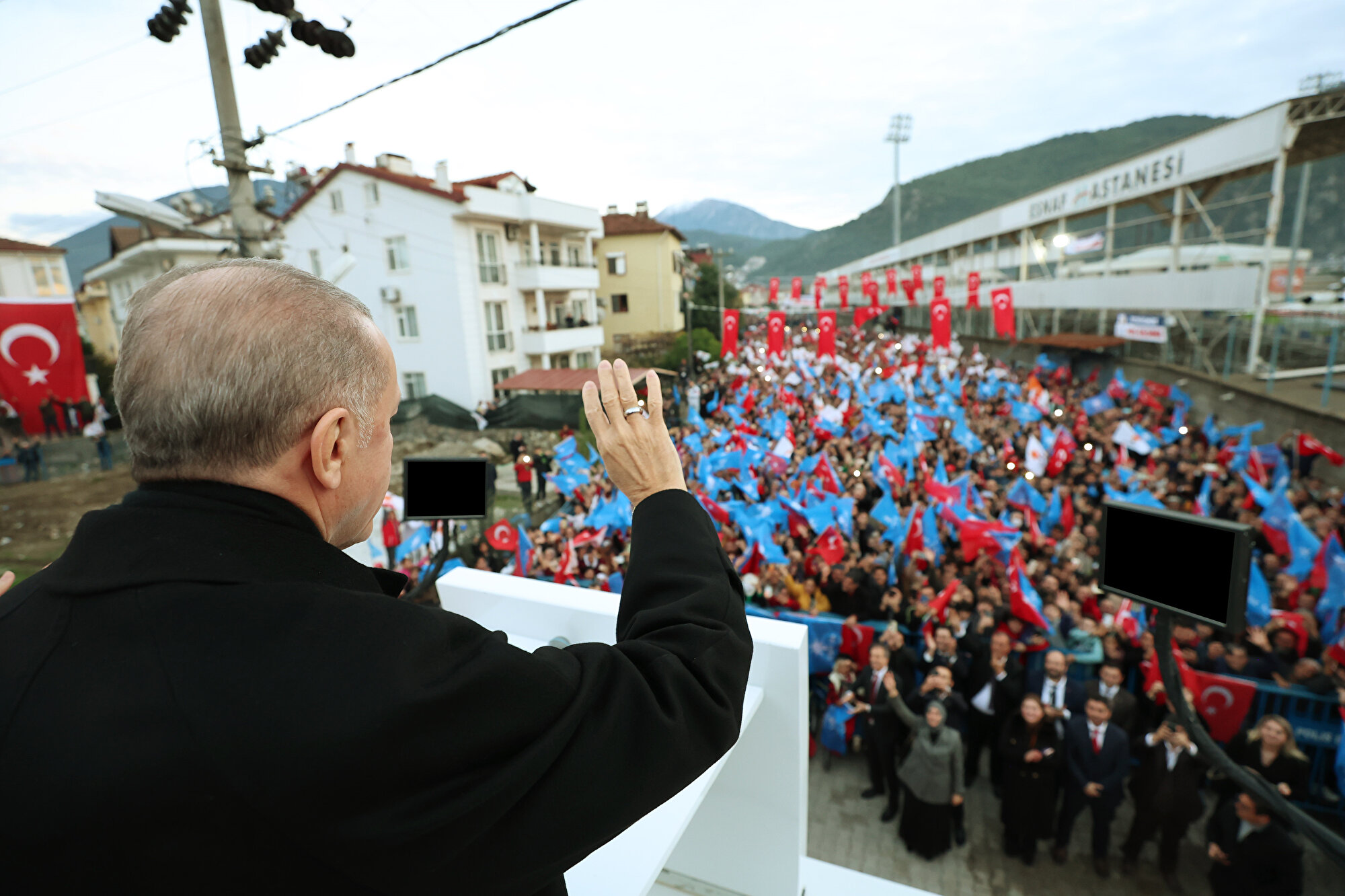 Erdoğan, "Adına 'Türkiye Yüzyılı' vizyonu dediğimiz bu kutlu mücadelede desteği yine sizlerden bekliyoruz. Artık sandık önümüze geliyor. Hazır mıyız? Artık Fethiye'de, Muğla'da sandıkları patlatmaya var mıyız?" şeklinde konuştu.