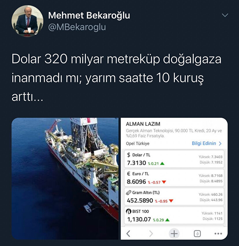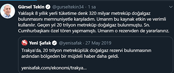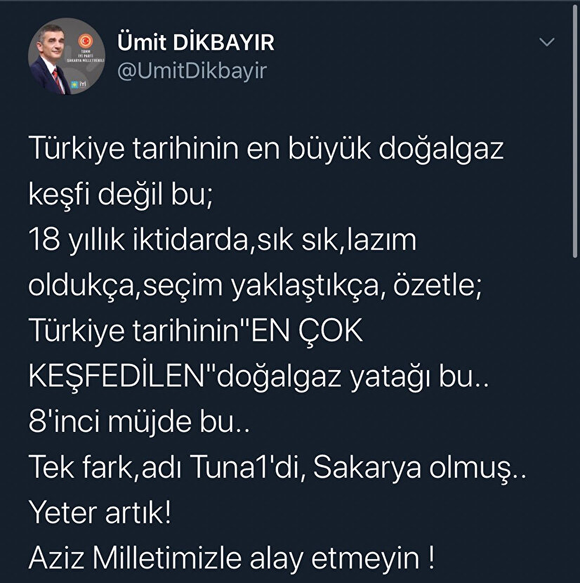 CHP'li eski Milletvekili Hüsnü Bozkurt, 2023'te kullanıma sunulacak doğal gazı seçimlere bağlayarak, "Sayısız aynı MÜJDE gibi unutulmaz umarız. Emeği geçenlere teşekkürler.800 deniyordu, hatta tombik yarısı da olsa idare eder diyordu,320 milyar metreküp imiş. Olsun! 2023’de kullanılabilecekmiş. Seçimden önce değil. Önce seçim,sonrası “Allah kerim” yani." dedi.
