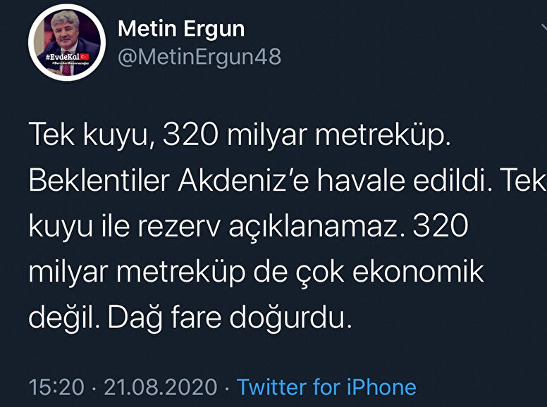 İYİ Partili Metin Ergun, tek kuyu ile rezerv açıklanamayacağını savunarak, "Tek kuyu, 320 milyar metreküp. Beklentiler Akdeniz'e havale edildi. Tek kuyu ile rezerv açıklanamaz" ifadelerini kullandı.