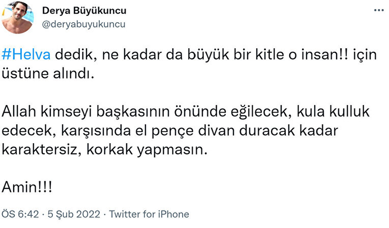 "Helva dedik, ne kadar da büyük bir kitle o insan!! için üstüne alındı. Allah kimseyi başkasının önünde eğilecek, kula kulluk edecek, karşısında el pençe divan duracak kadar karaktersiz, korkak yapmasın. Amin!!!"