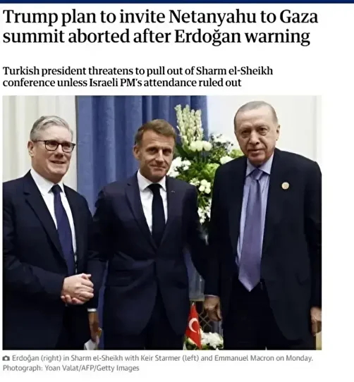 İngiliz Guardian gazetesi, Türkiye’nin kararlı duruşuna dikkat çektiği haberinde, “Trump’ın Netanyahu’yu Gazze zirvesine davet etme planı, Cumhurbaşkanı Erdoğan’ın uçağını Şarm El-Şeyh’e indirmeyeceği uyarısı sonrası iptal edildi” ifadelerine yer verdi. Haberde Erdoğan’ın, İsrail’in Gazze’deki saldırılarını defalarca “soykırım” olarak nitelendirdiği hatırlatılırken, Netanyahu hakkında Uluslararası Ceza Mahkemesi tarafından çıkarılan tutuklama emirleri de vurgulandı.