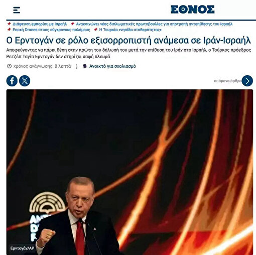 Ethnos ise Erdoğan'ın bölgede oynadığı role vurgu yaptı. Yunan gazete 'Erdoğan, İran ile İsrail arasında dengeleyici bir rol oynuyor' manşetini attı.